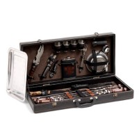 Под кожаными фиксаторами в кулинарном чемоданчике расположились всевозможные инструменты для полноценной трапезы. В их число входят изделия из нержавеющей стали – удобный складной мангал небольших размеров, шесть классических шампуров, столовые приборы на шестерых едоков – тарелки, вилки, ложки, стаканы. Все это дополняется стальным термосом, фляжкой, воронкой для ее заполнения и рюмками со стильным серебряно-никелевым покрытием.