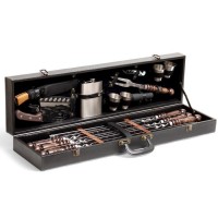 Для разделки мяса в наборе предусмотрен компактный и ухватистый охотничий нож с ручкой, вырезанной из древесины европейского ореха? и латунным больстером. К ножу прилагается двузубая «мясная» вилка. Завершают комплект для природных или дачных посиделок штопор сомелье, безотказная зажигалка и светодиодный фонарик. От попадания внутрь кейса пыли или грязи при его переноске или транспортировке предусмотрен прочный прозрачный чехол из спанбонда.