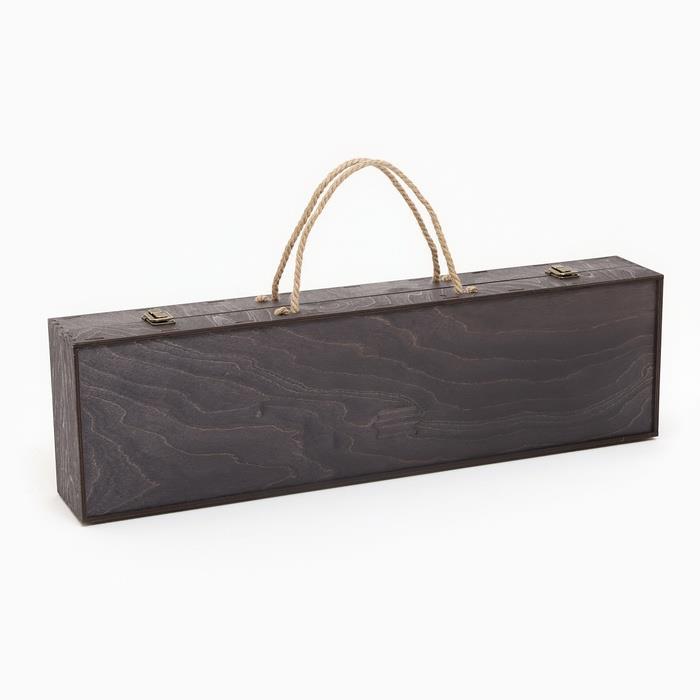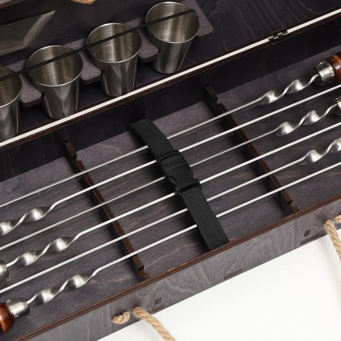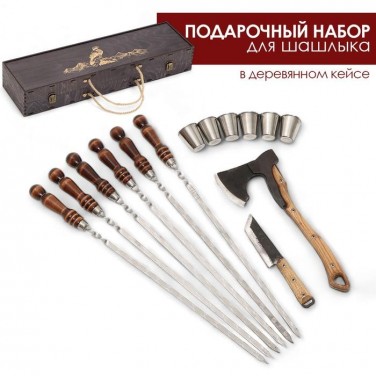 | Комплектация | - кейс из натурального дерева; - шесть шампуров из нержавеющей стали; - 6 стопок; - нож; - топор. |