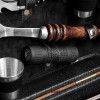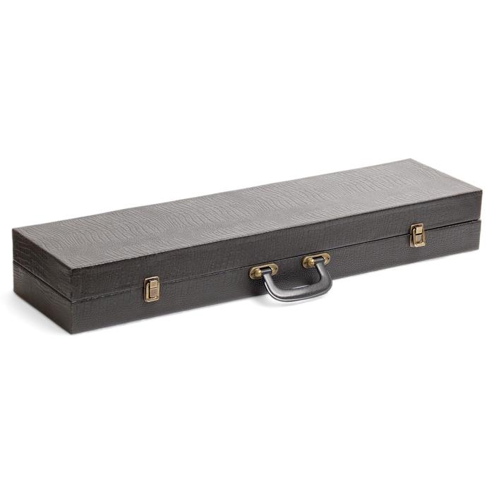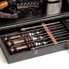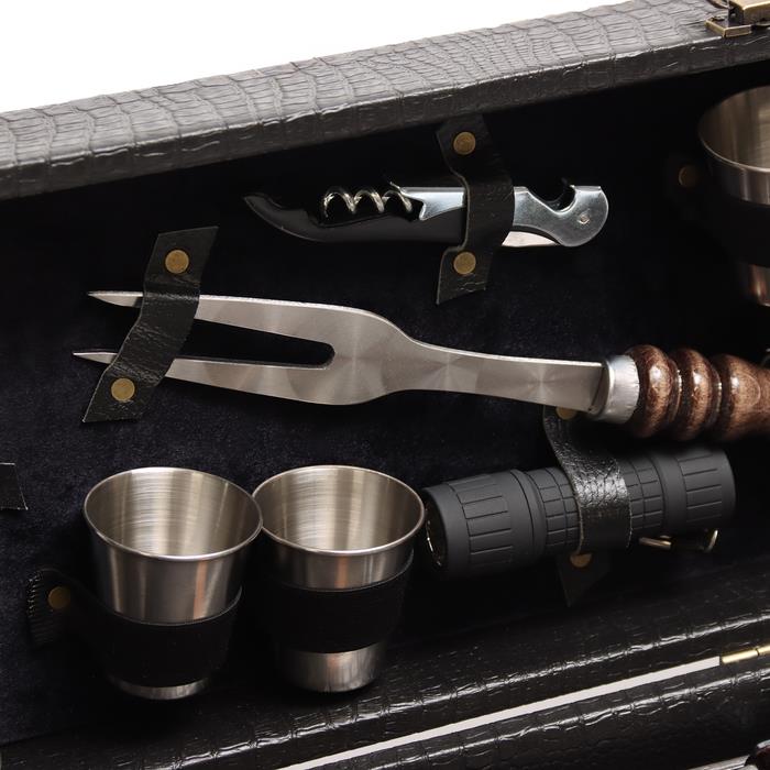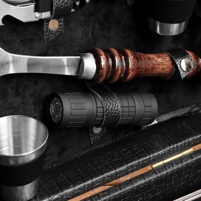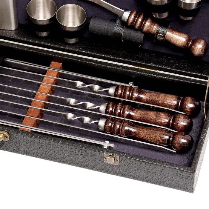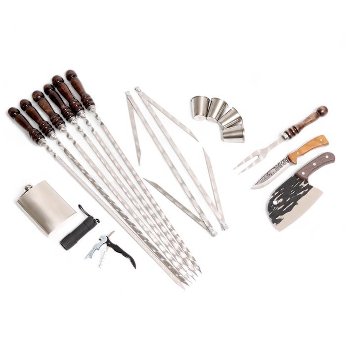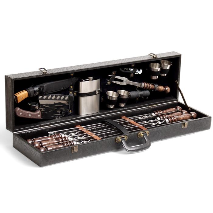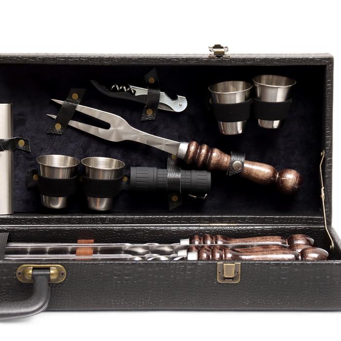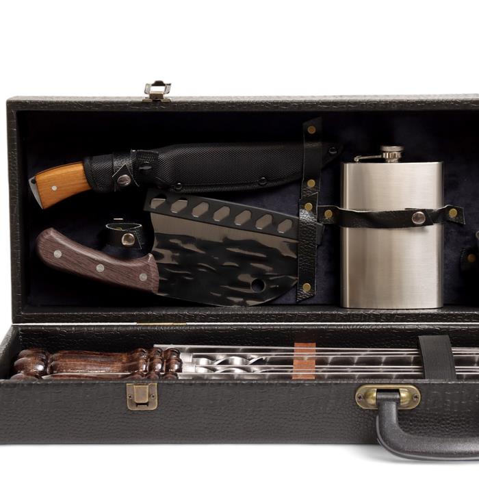 | Комплектация | - кейс из эко-кожи; - шесть шампуров из нержавеющей стали с деревянной ручкой из бука; - таганок (раскладной мангал); - нож для снятия мяса и овощей с шампура; - открывалка; - зажигалка; - фляга; - четыре стопки из нержавеющей стали; - кизлярский нож; - топорик. |