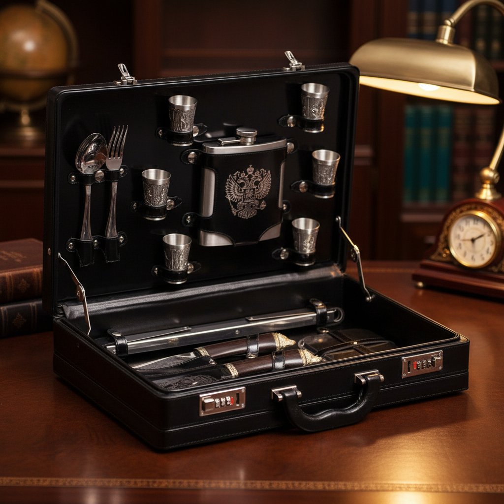 | Комплектация | - кейс из натуральной кожи с тиснением изображения; - фляжка из нержавеющей стали; - 6 тарелок из нержавеющей стали - 6 вилок из нержавеющей стали; - 6 ложек из нержавеющей стали; - 6 шампуров из нержавеющей стали; - мангал складной из нержавеющей стали; - нож-тяпка из высоколегированной нержавеющей стали, рукоятью из венге и ювелирного литья мельхиора; - нож охотничий из высоколегированной нержавеющей стали, рукоятью из венге и ювелирного литья мельхиора; - штопор сомелье; - зажигалка бензиновая Zippo (не заправлена); - воронка из нержавеющей стали для заполнения фляжки; - 6 стопок оловянных, высокоточное ювелирное литье; - чехол для кейса из высокопрочного прозрачного пластика. |