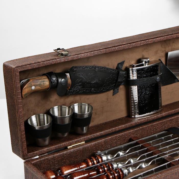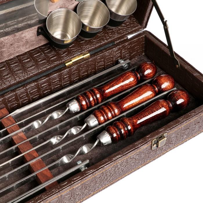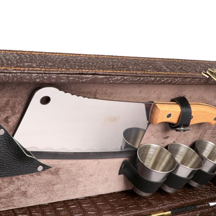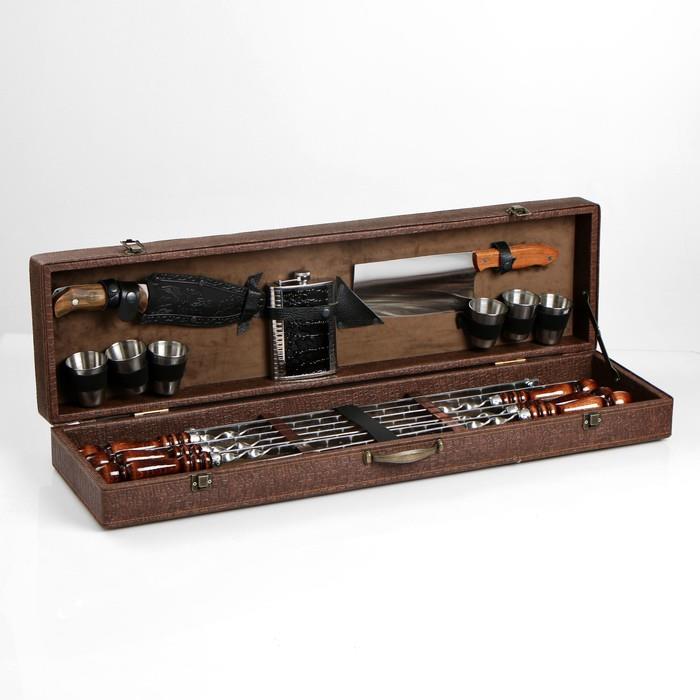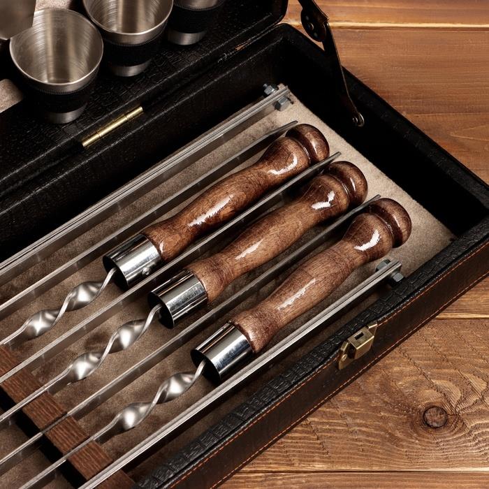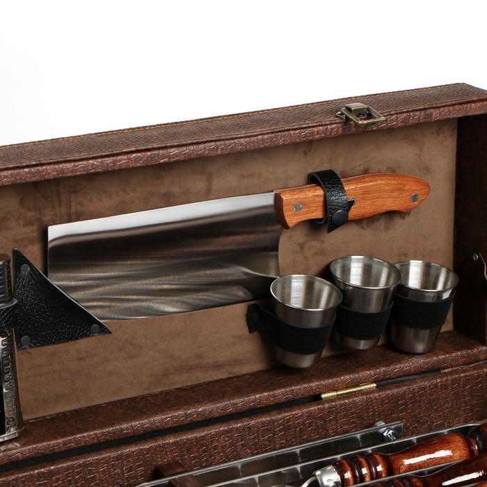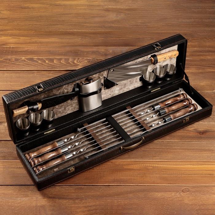 | Комплектация | - кейс из эко-кожи; - шесть шампуров из нержавеющей стали с деревянной ручкой из бука; - таганок (раскладной мангал); - сетка барбекю; - шесть стопки из нержавеющей стали; - фляга; - кизлярский нож; - топорик. |