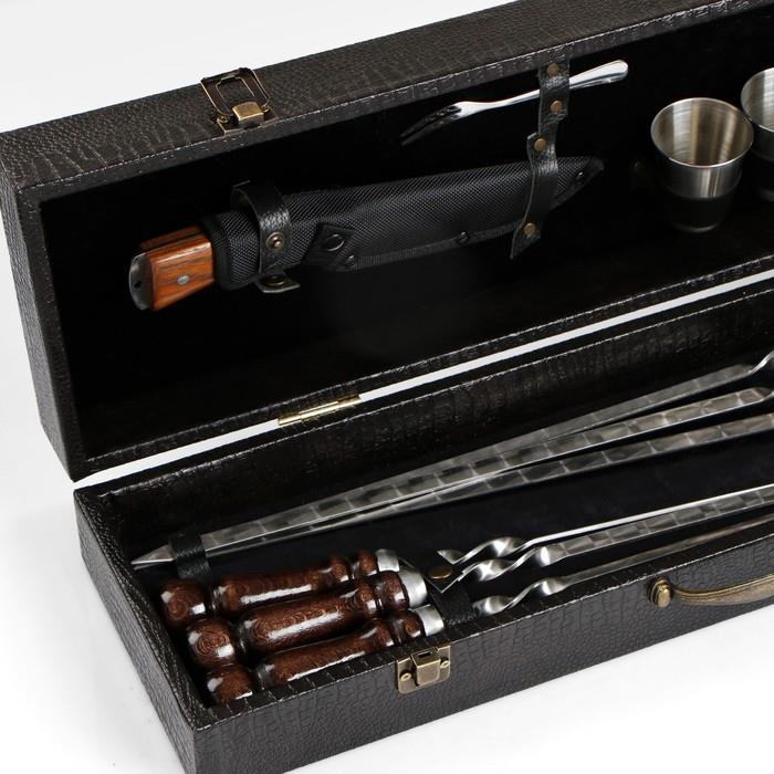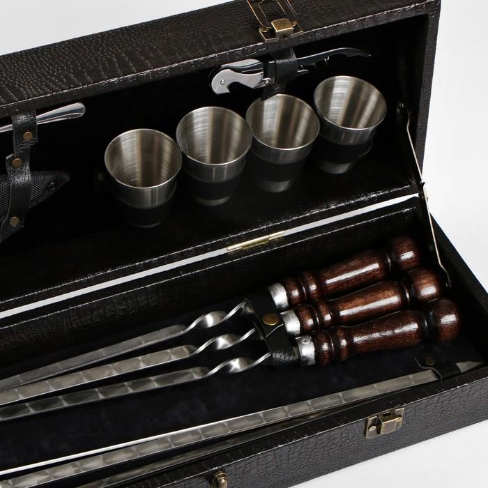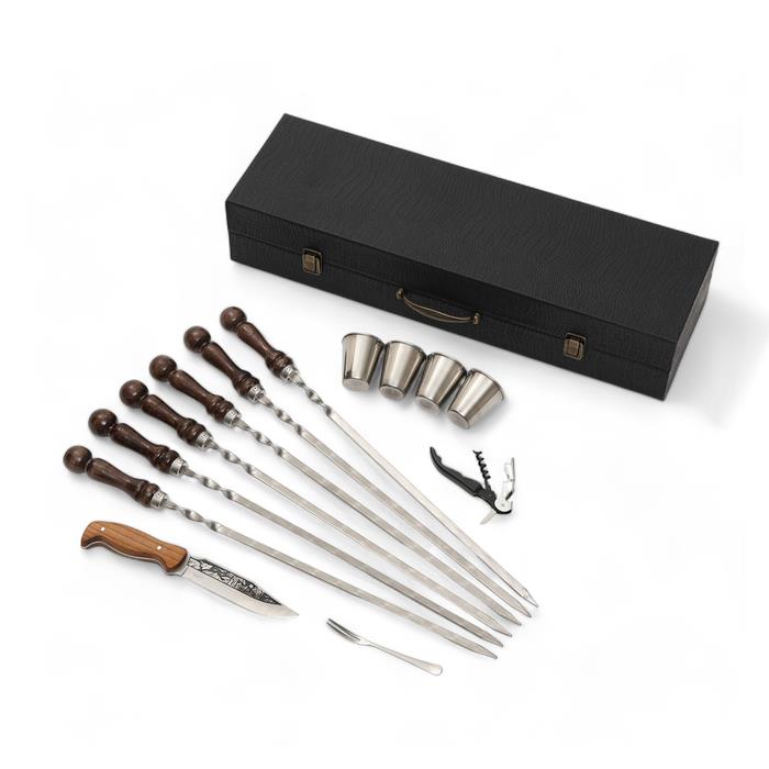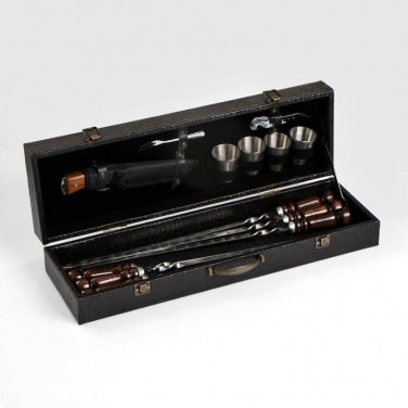 | Комплектация | - кейс из эко-кожи; - шесть шампуров из нержавеющей стали с деревянной ручкой из бука; - открывалка; - четыре стопки из нержавеющей стали; - кизлярский нож; - вилка для снятия мяса. |