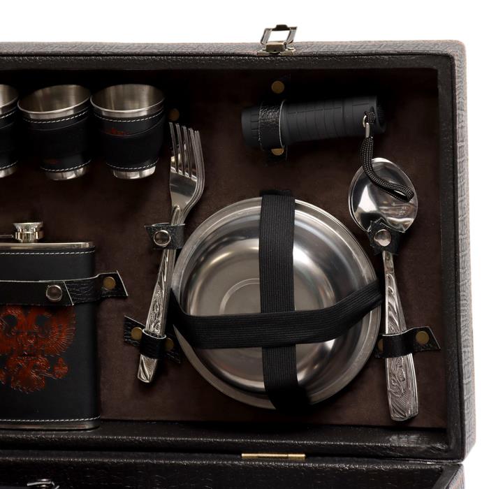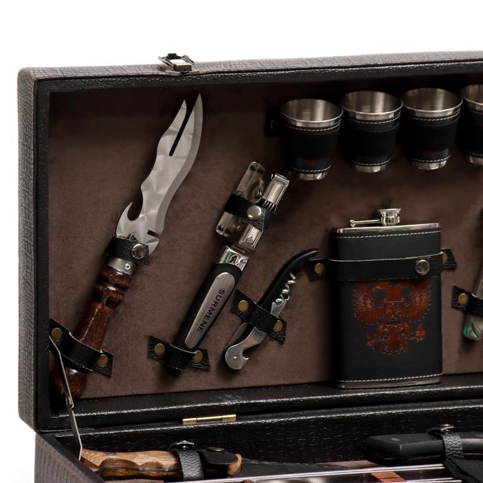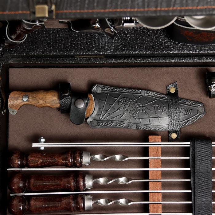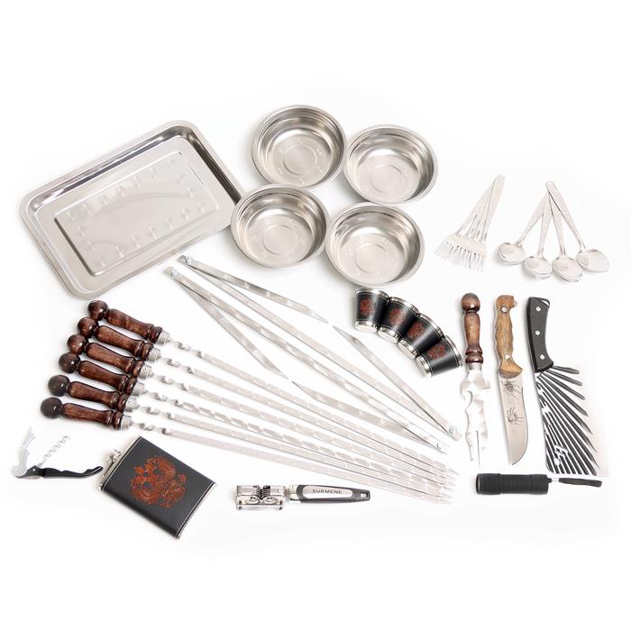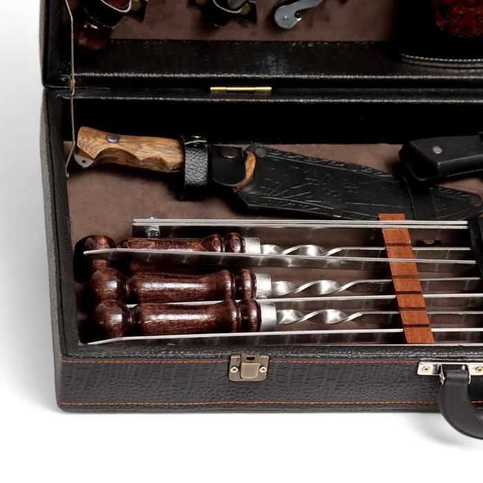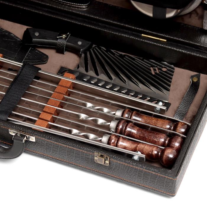 | Комплектация | - кейс из эко-кожи; - шесть шампуров из нержавеющей стали с деревянной ручкой из бука; - таганок (раскладной мангал); - нож для снятия мяса и овощей с шампура; - штопор; - зажигалка; - фонарик; - поднос из нержваеющей стали для подачи шашлыка; - четыре тарелки из нержавеющей стали; - четыре вилки из нержавеющей стали; - четыре ложки из нержавеющей стали; - четыре стопки из нержавеющей стали; - кизлярский нож; - топорик. |