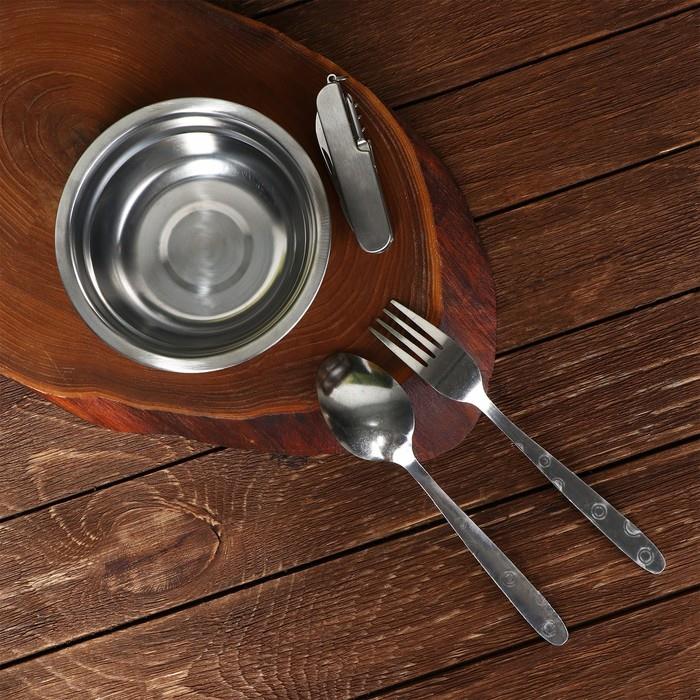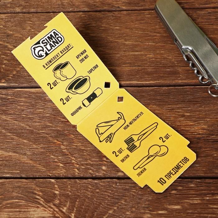 | Комплектация | - две тарелки: - две ложки; - две вилки; - две кружки объёмом 250 мл; - мультитул; - фонарик. |