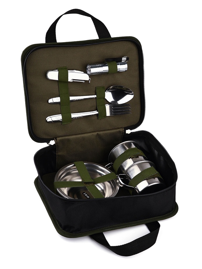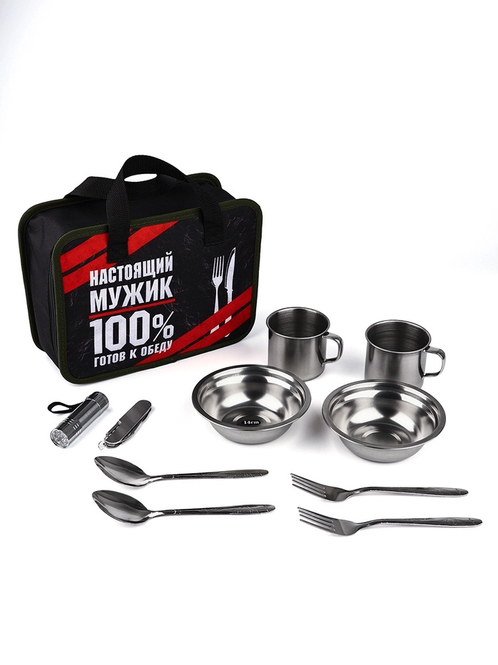 | Комплектация | - две тарелки; - две кружки; - две ложки; - две вилки; - фонарик; - мультитул. |