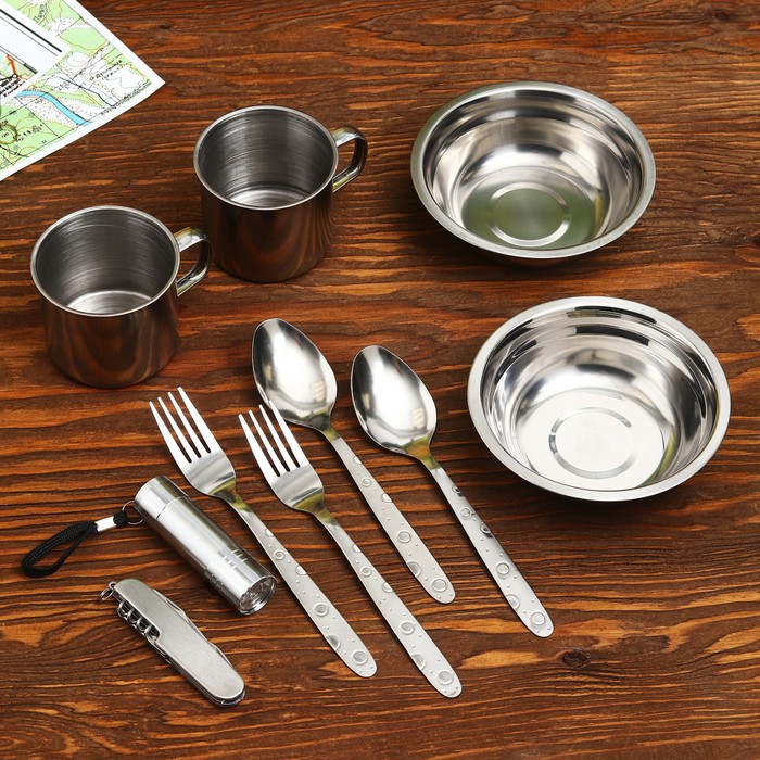 | Комплектация | - две тарелки; - две ложки; - две вилки; - две кружки; - мультитул; - фонарик. |