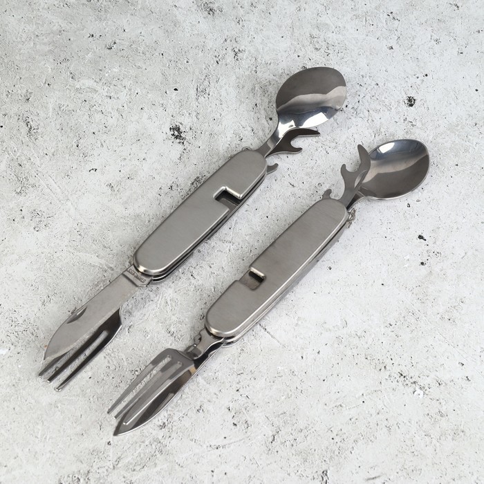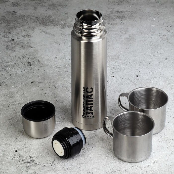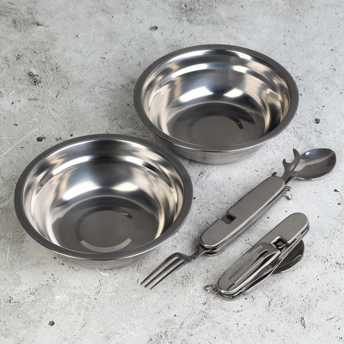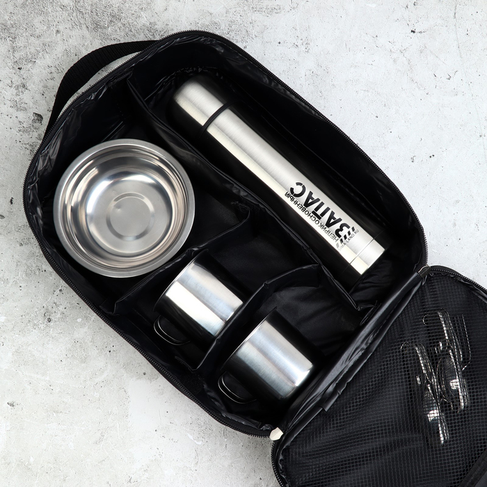 | Комплектация | - термос из нержавеющей стали объёмом 500 мл; - две кружки из нержавеющей стали по 250 мл; - две тарелки из нержавеющей стали по 300 мл; - нож-мультитул; - чехол. |