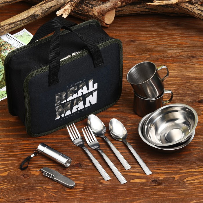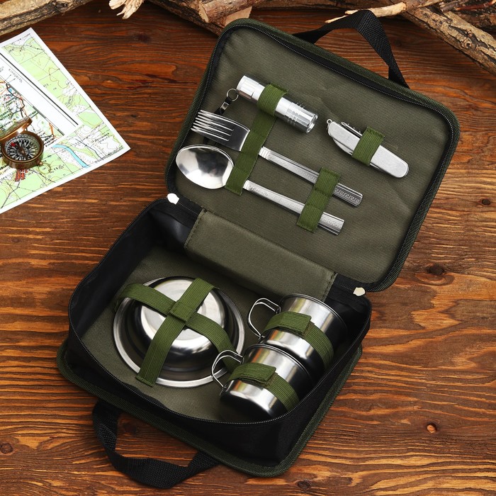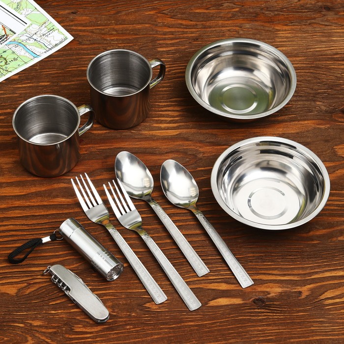| Комплектация | - две тарелки; - две ложки; - две вилки; - две кружки; - фонарик; - мультитул. |