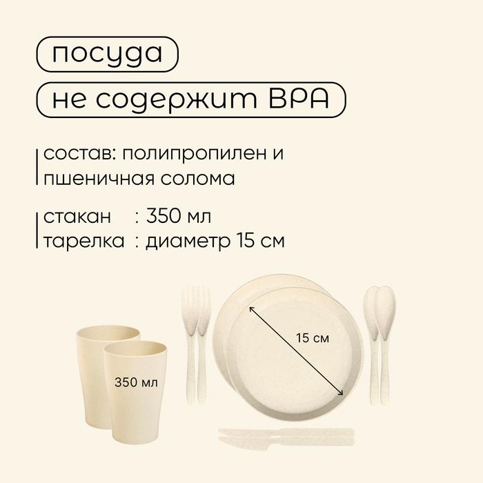 | Комплектация | - две тарелки по 15 см.; - два стакана на 350 мл.; - две вилки; - две ложки; - два ножа; - салфетка. |