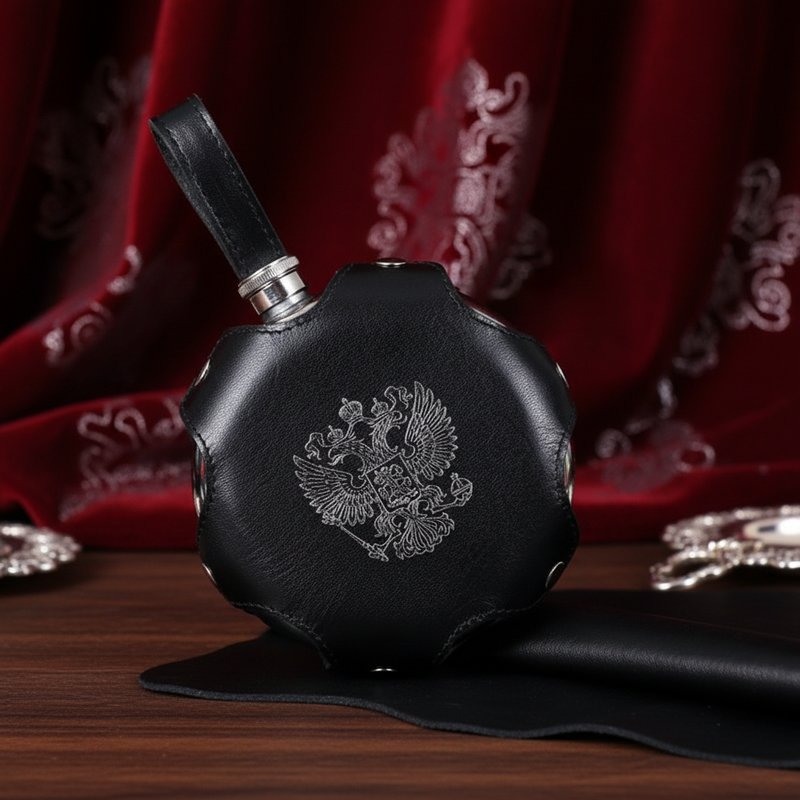 Кстати, чёрная кожа в сочетании в хромированными элементами отделки чрезвычайно нравится ещё и поклонникам рок-музыки, и мотоциклистам – байкерам. Но, как ни странно, основными потребителями конкретно этой модели в нашем интернет-магазине стали иностранцы, для которых ёмкость, прежде всего, является этаким сувениром. Знают об этом и наши сограждане, в каждую свою поездку за рубеж захватывая и хотя бы одну круглую гербовую фляжку, наполненную «национальным русским напитком».