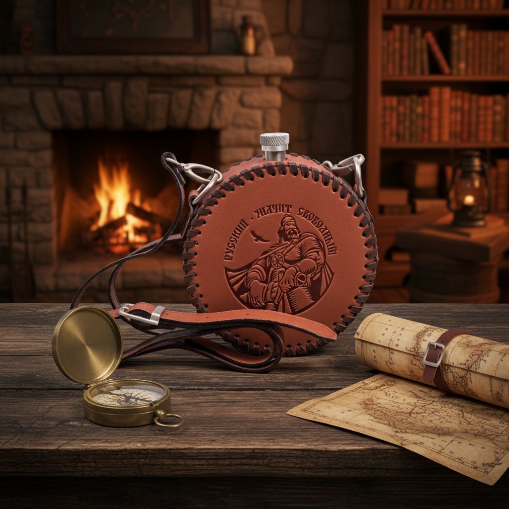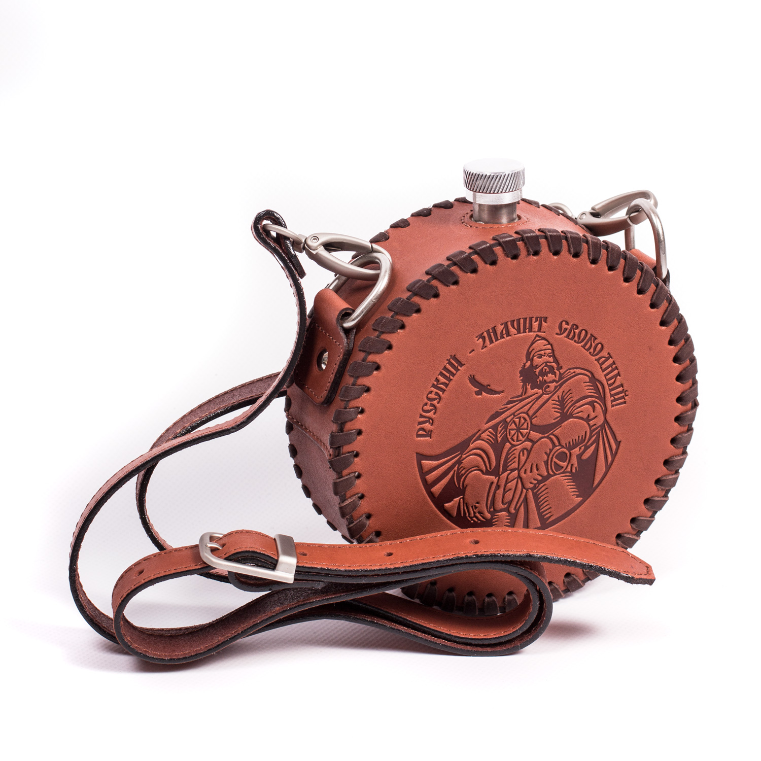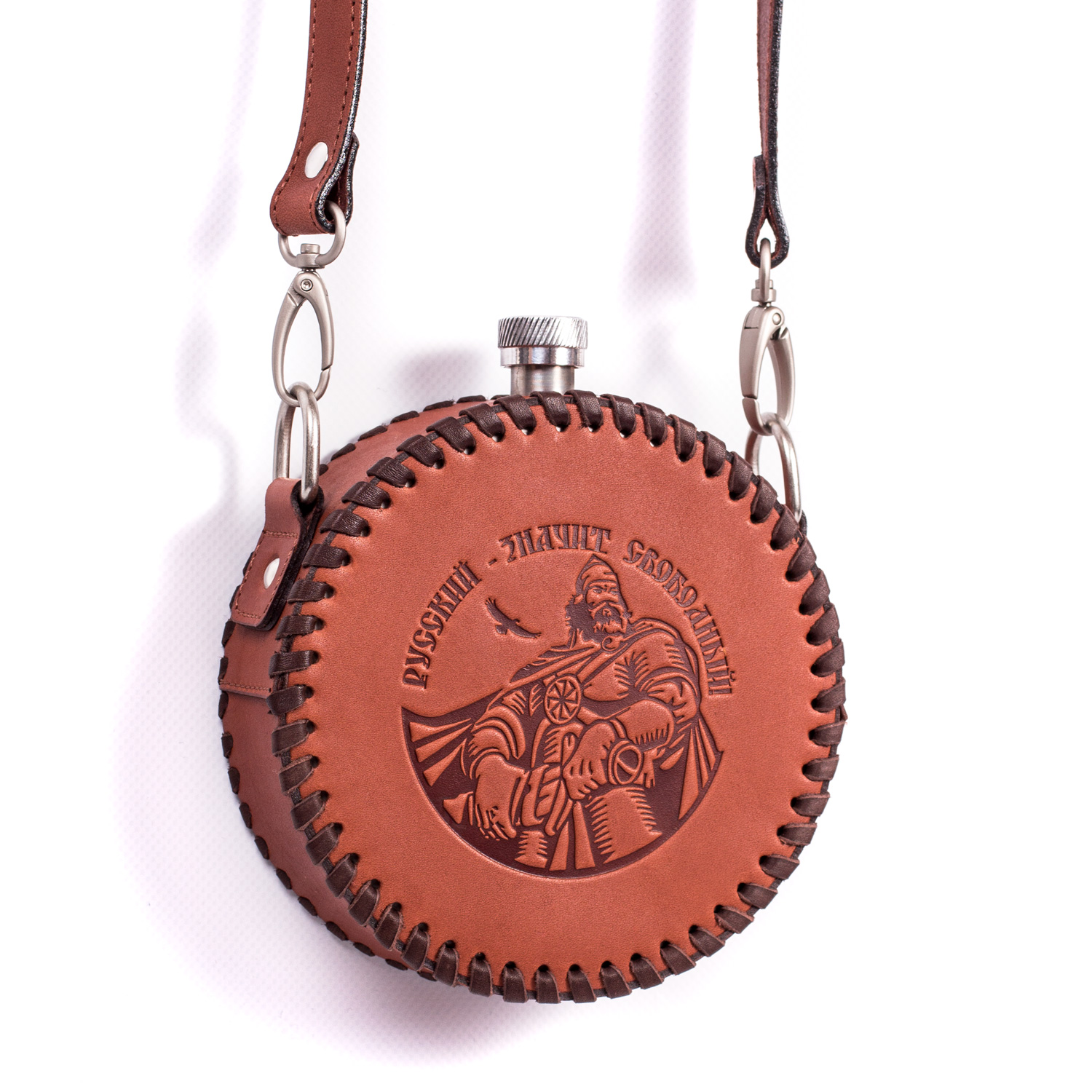 Фляга круглая «Русский, значит свободный» (из кожи)