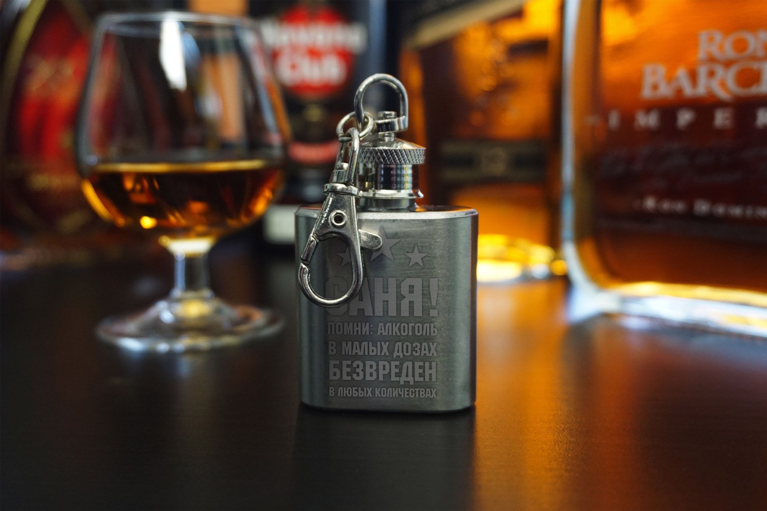 И для какого бы представителя сильного пола ни приобретался такой подарок, он обязательно будет «индивидуализирован» под будущего хозяина. Дело – в том, что на такую фляжку-брелок по заказу покупателя с помощью гравировки наносится смешная надпись или имя того, кому сувенир предназначен, например «Алкоголь в малых дозах».