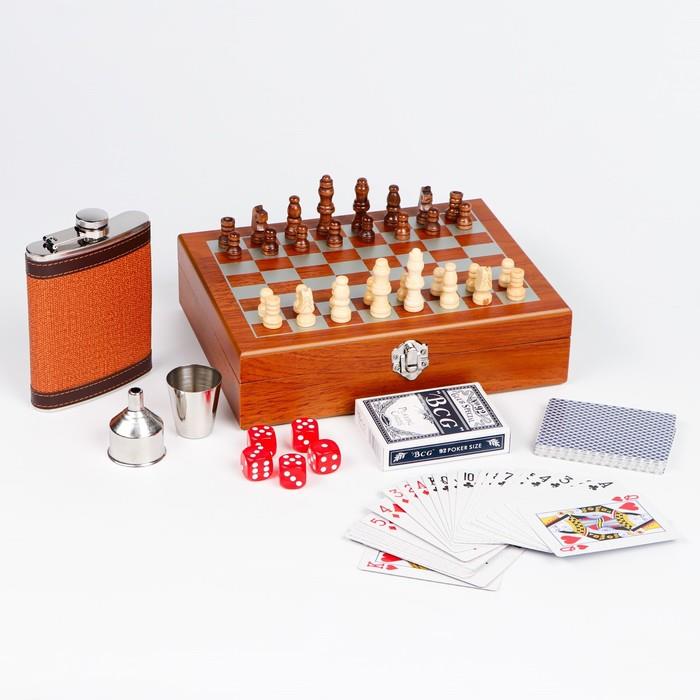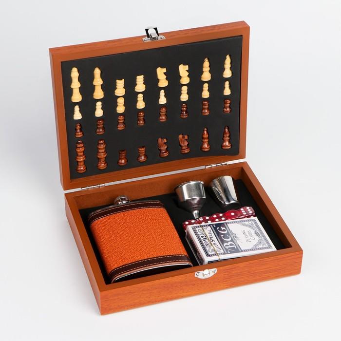 | Комплектация | - фляга из нержавеющей стали, покрыта эко-кожей; - рюмка из нержавеющей стали объёмом 50 мл; - воронка из нержавеющей стали; - 5 кубиков из пластика; - шахматы из дерева; - карты из пластика, 54 шт. |