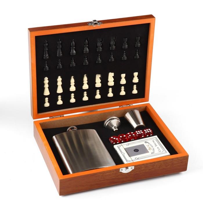 | Комплектация | - фляга из нержавеющей стали; - рюмка из нержавеющей стали объёмом 50 мл.; - воронка из нержавеющей стали; - 5 кубиков из пластика.; - шахматы из дерева; - карты из пластика, 54 шт. |