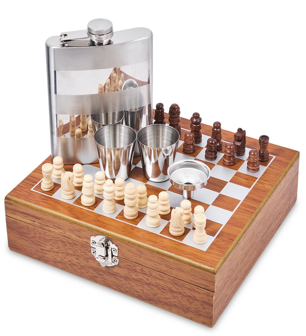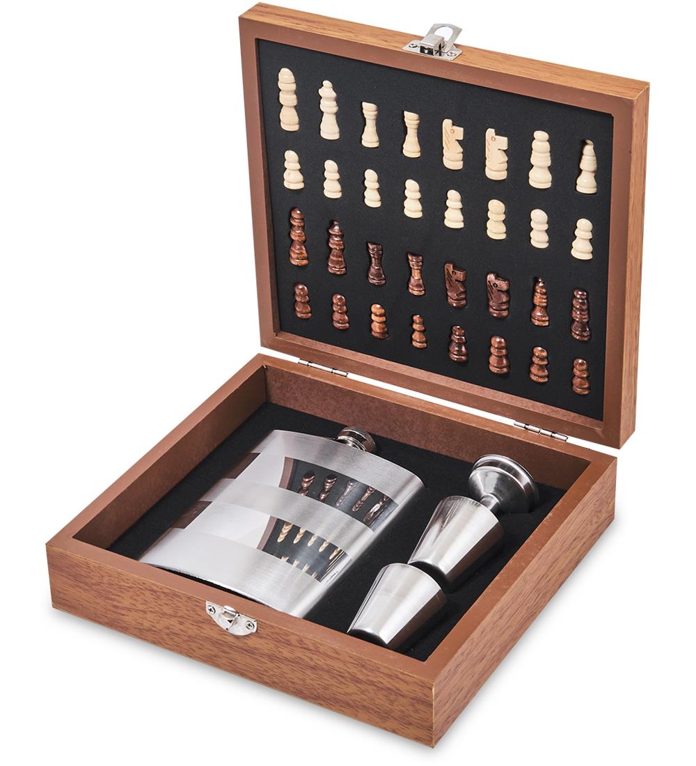 | Комплектация | - фляга из нержавеющей стали; - две стопки из нержавеющей стали; - воронка; - шахматы деревянные. |