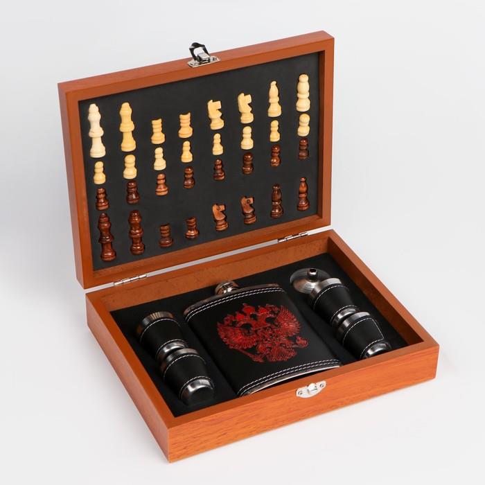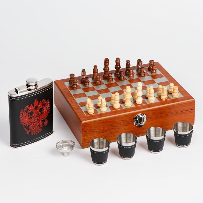 | Комплектация | - фляга из нержавеющей стали, покрыта эко-кожей, 13 × 10 см; - воронка из нержавеющей стали; - 4 рюмки из нержавеющей стали объёмом 50 мл; - шахматы из дерева. |