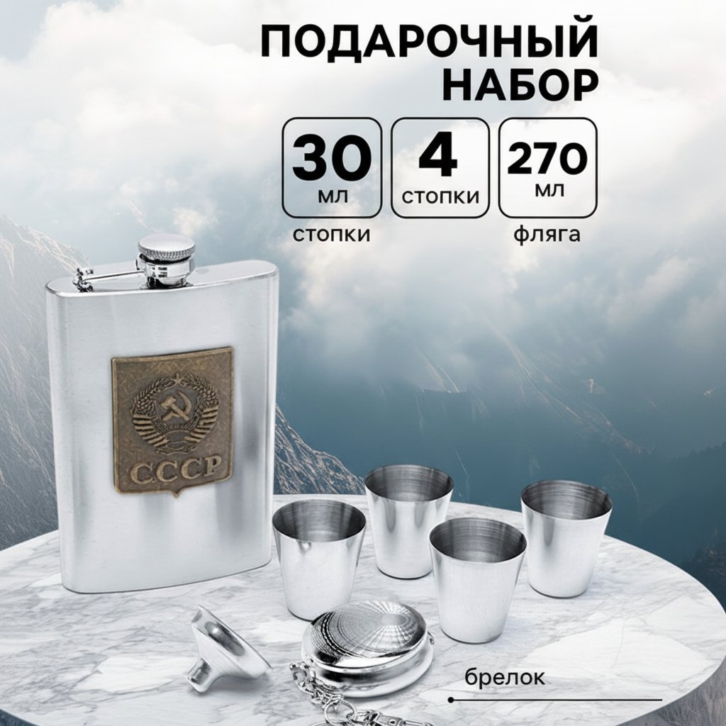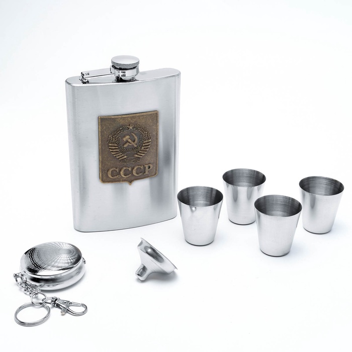 | Комплектация | - фляга из нержавеющей стали; - четыре стопки из нержавеющей стали; - воронка; - брелок. |