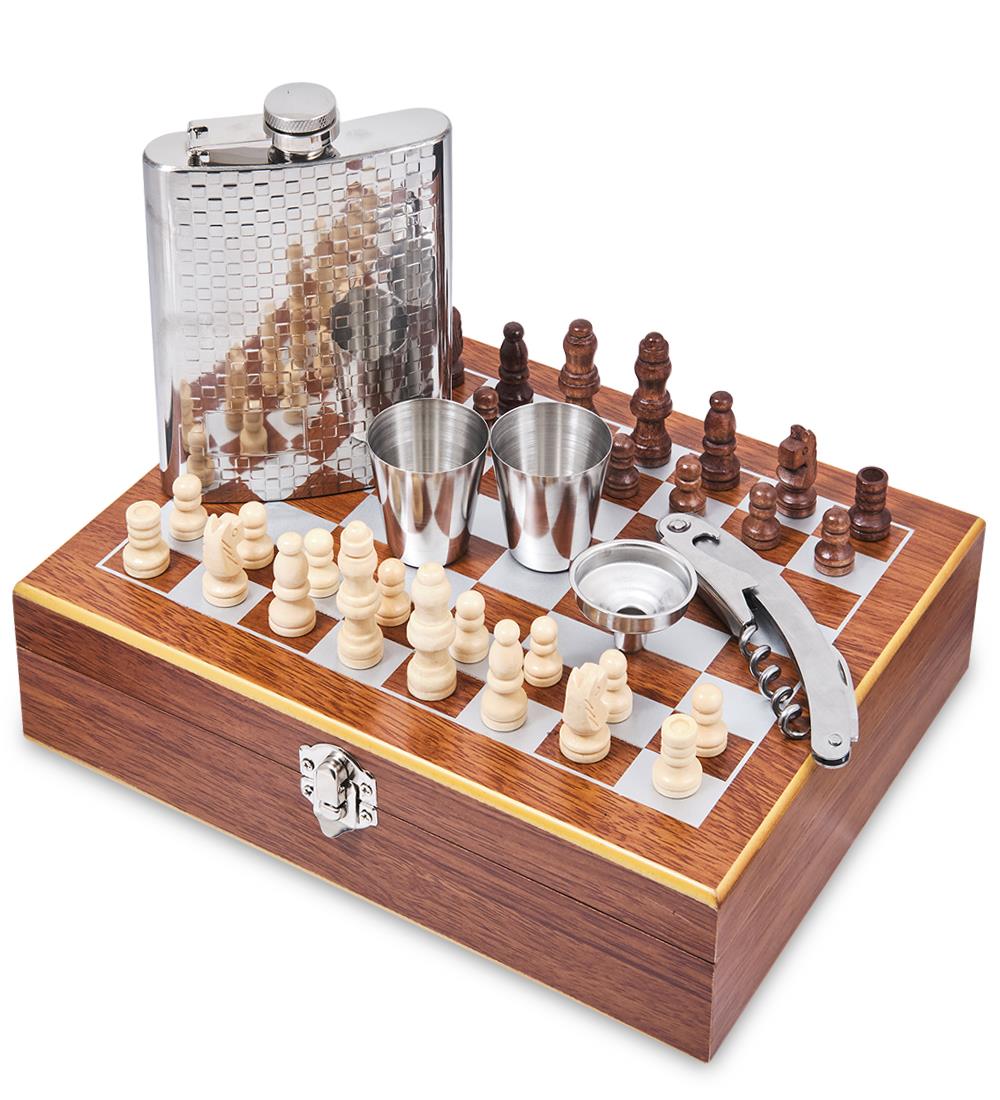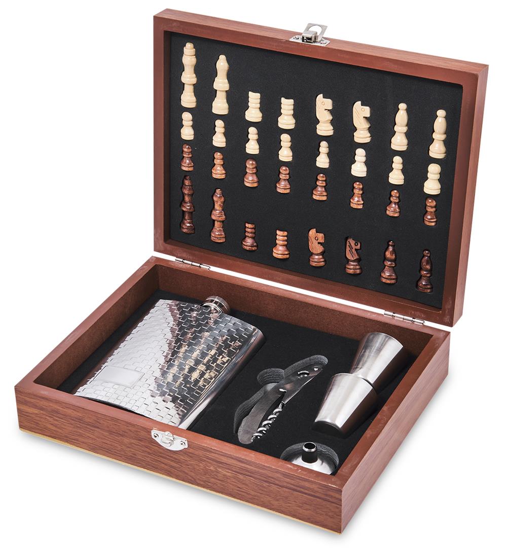 | Комплектация | - фляга из нержавеющей стали; - две стопки из нержавеющей стали; - мультитул; - воронка; - шахматы деревянные. |