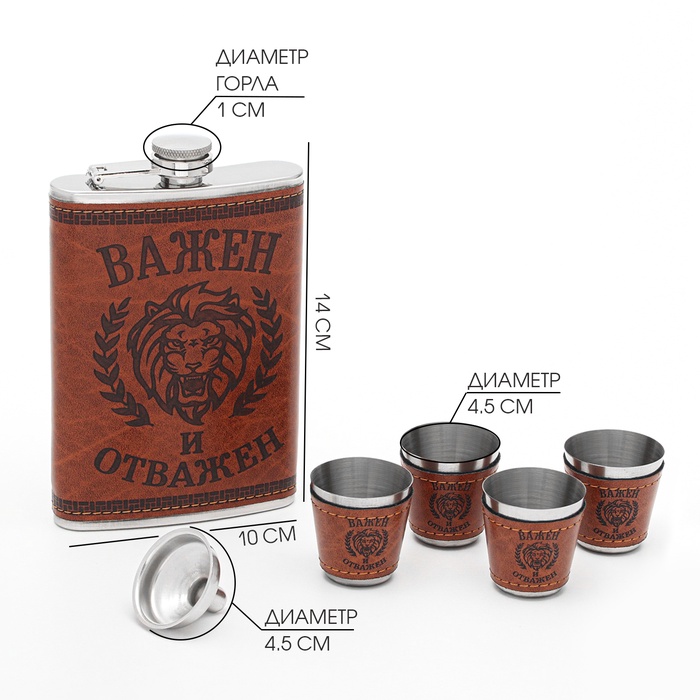 | Комплектация | - фляга из нержавеющей стали; - четыре стопки из нержавеющей стали; - воронка. |