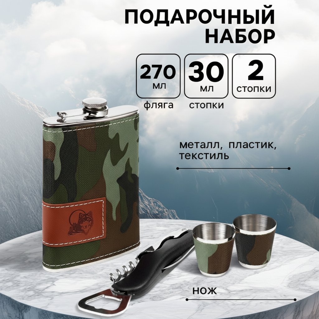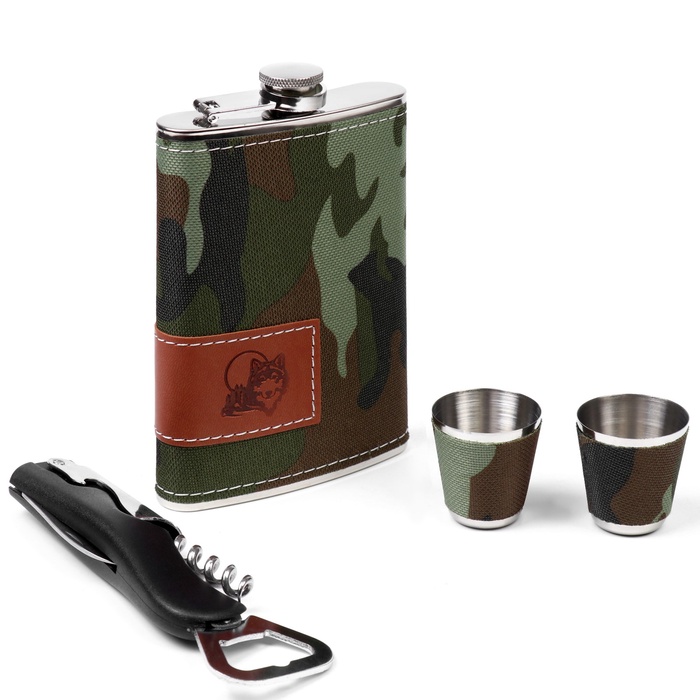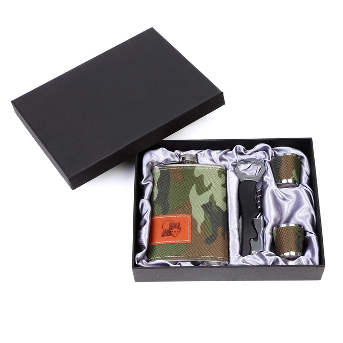 | Комплектация | - фляга из нержавеющей стали; - две стопки из нержавеющей стали; - складной нож. |