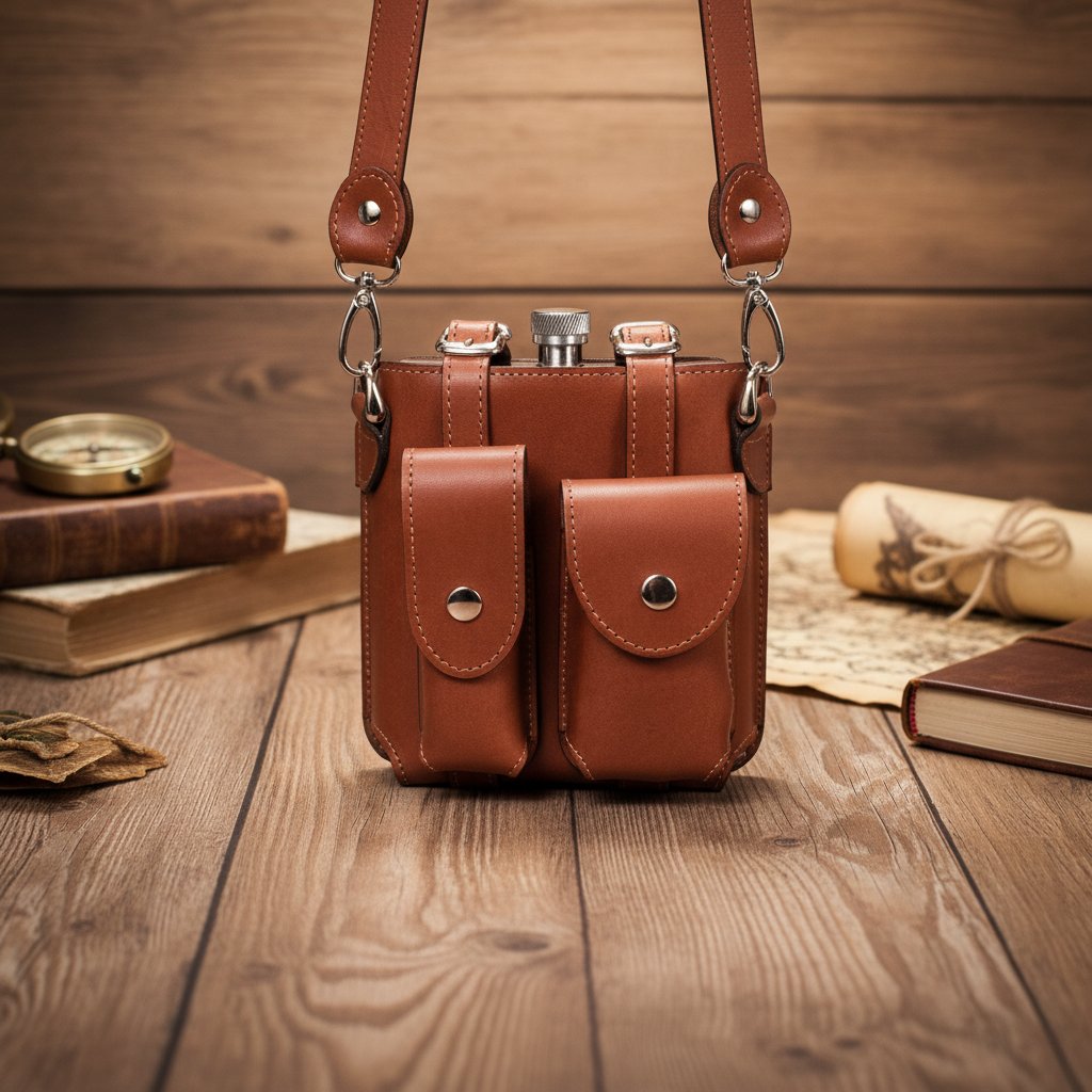 Фляга помещена в плотный немаркий футляр, пошитый из натуральной кожи приятного коричневого цвета. Конструкция футляра предусматривает два фиксирующих фляжку кожаных ремешка с металлическими застежками, два нашитых по бокам металлических крепления для карабинов присоединяющегося к футляру наплечного ремня и два передних накладных кармана для аксессуаров. В качестве сопутствующих фляге аксессуаров выступают удобный складной нож компактных размеров и пара складывающихся стаканчиков.
