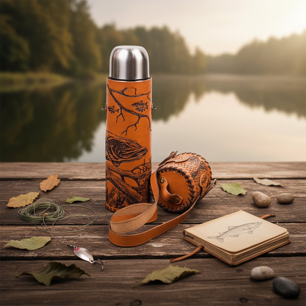 Над внешним дизайном чехла славно поработал талантливый художник. Он украсил поверхность окрашенной в насыщенный оранжевый цвет кожи впечатляющим рыболовным сюжетом и роскошным растительным орнаментом. Благодаря этому походный аксессуар смотрится очень эффектно и гарантированно притянет к себе восхищенные взгляды окружающих.