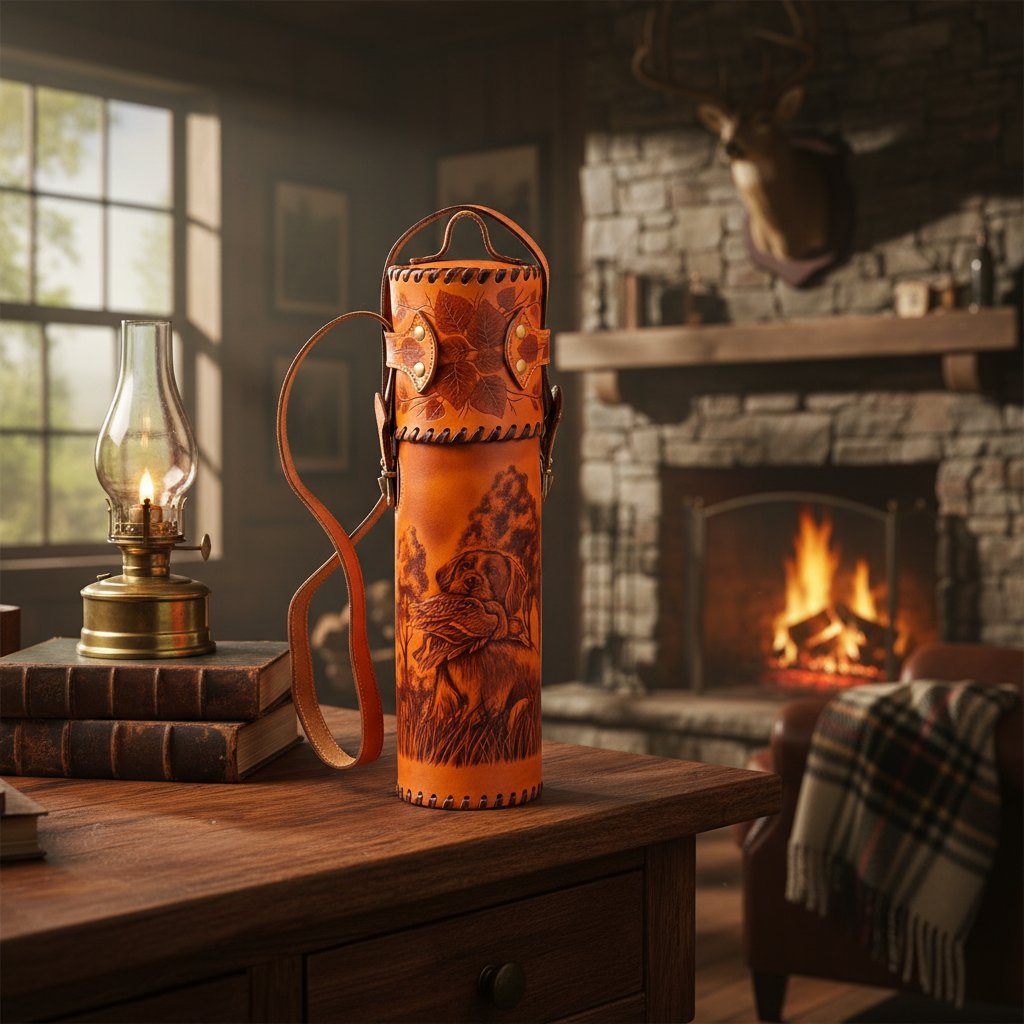 Над внешним дизайном чехла славно поработал талантливый художник. Он украсил поверхность окрашенной в насыщенный оранжевый цвет кожи впечатляющим охотничьим сюжетом и роскошным растительным орнаментом. Благодаря этому походный аксессуар смотрится очень эффектно и гарантированно притянет к себе восхищенные взгляды окружающих.