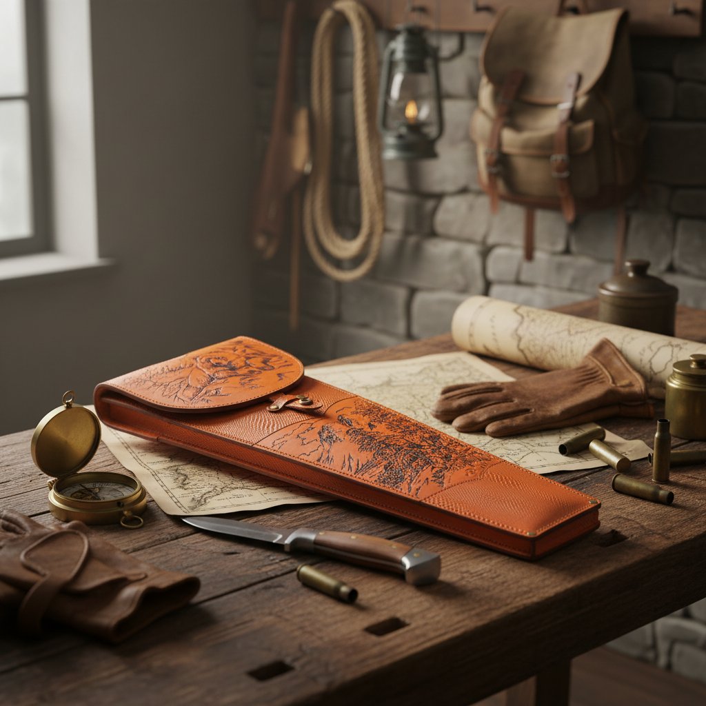 Не менее вдумчиво создатели эксклюзивного комплекта подошли и к оформлению чехла-колчана. На его кожаную поверхность методом пирографии (декоративного выжигания) нанесено изображение, в котором гармонично соединились силуэт медведя на фоне горного склона и живописный природный пейзаж. Тщательность прорисовки каждой линии производит сильное впечатление. Пирография дает опытному мастеру возможность создать насыщенный рисунок, который, в отличие от красок, не стирается и не блекнет с течением времени.