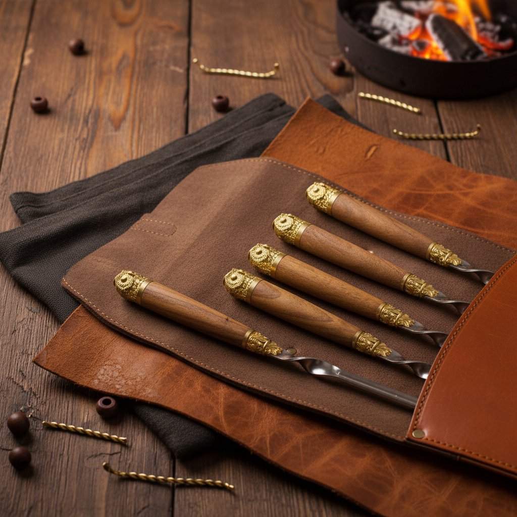 | Комплектация | - колчан для шампуров из натуральной кожи с тиснением изображения; - шесть шампуров с рукоятью из ореха и латуни. |
