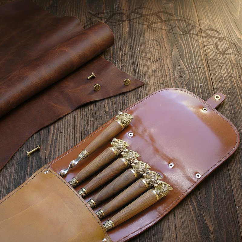 Уникальную эстетику комплекта помогает создавать чехол-колчан, пошитый из натуральной кожи ручной выделки и облагороженный художественной росписью. На него методом пирографии – декоративного выжигания нанесено изображение волчьей морды, дополненное охотничьим сюжетом и искусным орнаментом в народной стилистике.