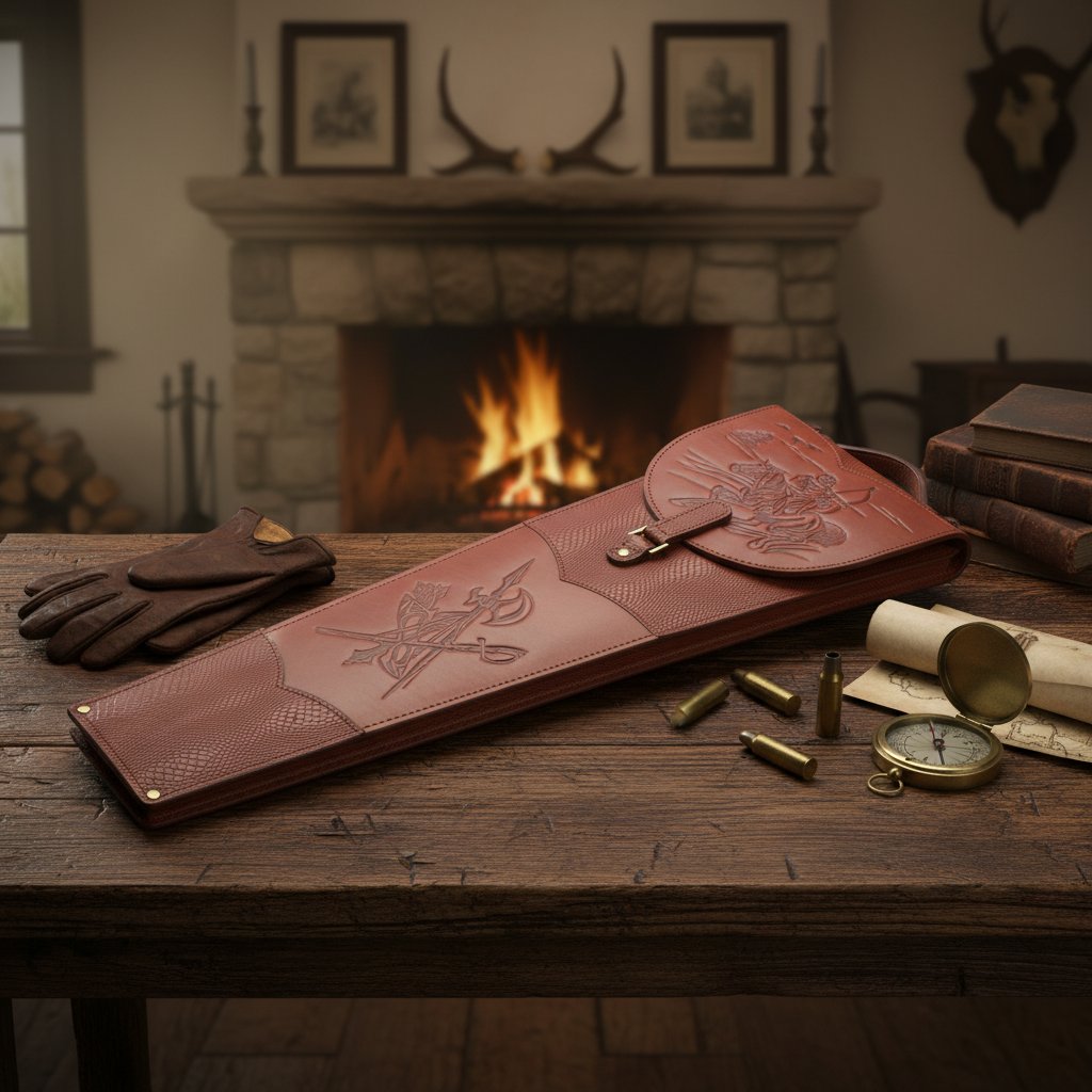 Колчана из плотной кожи эффектного красно-коричневого оттенка. Изделие украшено тиснением.