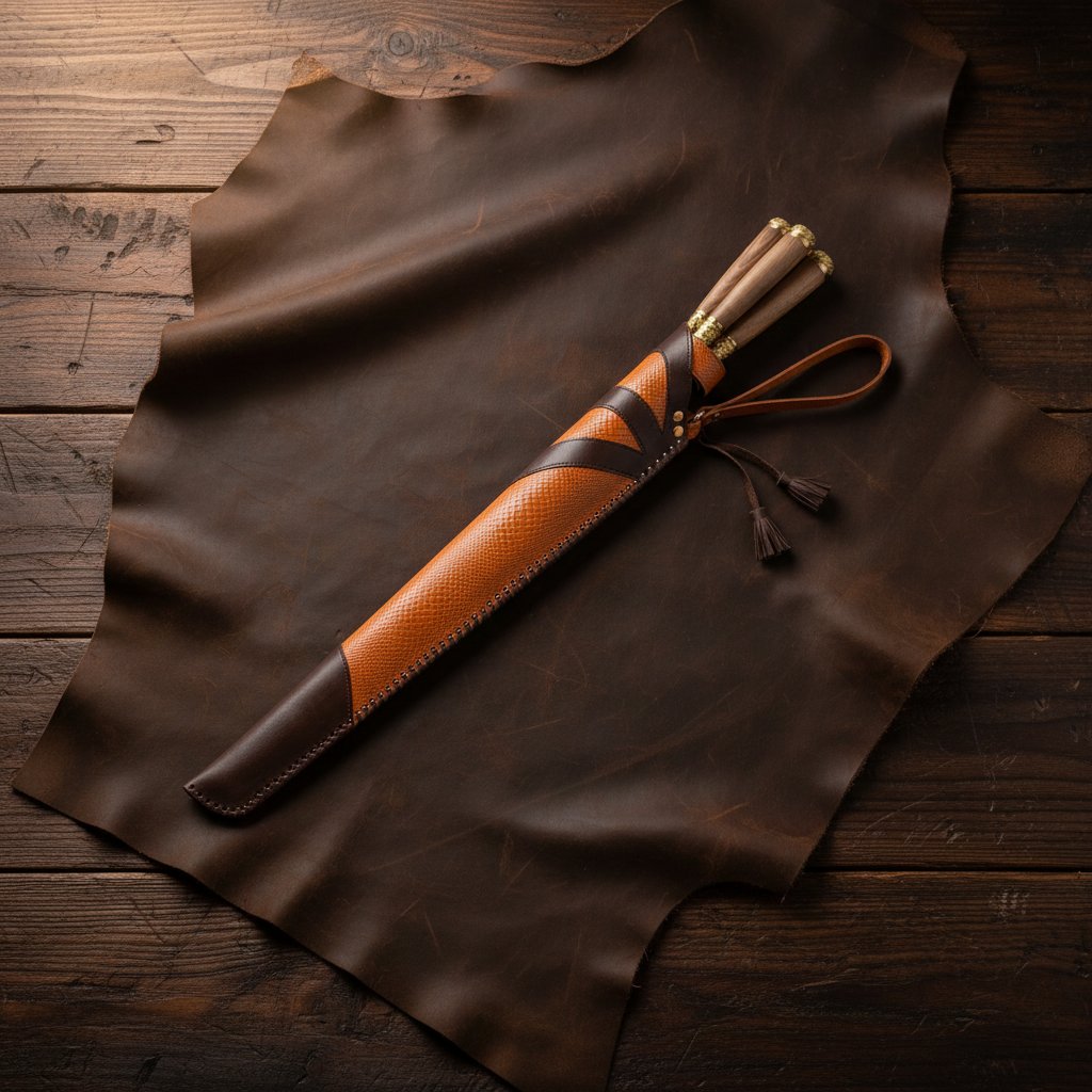 Материал рукоятей — натуральный орех в сочетании с декоративными элементами из латуни. Украшения изготовлены с помощью точного художественного литья, вручную, а потому выглядят будто ювелирные изделия. Весь комплект для удобства размещён в чехол- колчан из натуральной кожи. То, как оформлен чехол — достойно отдельного внимания. Яркий, стильный с дополнительным декором в виде кисточек и сочетанием янтарного и терракотового оттенков — всё в нём привлекает внимание. Качество исполнения — на высоте: каждый шов идеально ровный, выгравированный рисунок симметричный, что удовлетворит запросы самых привередливых и педантичных натур.