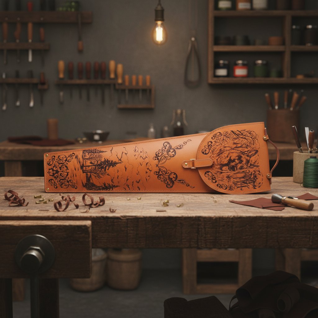 Кулинарный комплект уложен в специализированный чехол типа колчан, для пошива которого была использована натуральная кожа колоритного светло-оранжевого цвета. Внешняя сторона колчана расписана рукой талантливого художника. Он вдохновлялся охотничьими сюжетами и природными красотами.
