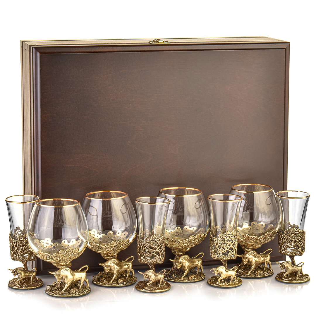 ✓ бокалы для спиртных напитков – какой же Телец откажется от нескольких глотков крепкого напитка, если тот будет разлит в подарочные бокалы? А в нашей подборке есть сразу несколько вариантов. Например, бокалы для вина в стиле ретро – с «граммофонной» чашей, утолщённой посередине ножкой и золотым ободком по краю. Можно приобрести великолепные бокалы для виски с причудливо изогнутыми стенками и толстым квадратным дном, упакованные в оригинальный футляр или в изящную шкатулку. Кроме пары самих бокалов в такой комплект входят камни и специальные щипцы. Если же адресат предпочитает коньяк, отличным выбором будет набор элегантных бокалов для этого напитка, приземисто-широких в нижней части и зауженных кверху, с позолотой по краю. Если требуется эксклюзив, лучше всего на эту роль подойдет комплект бокалов для коньяка «Золотой Телец» с художественно оформленной ножкой из позолоченной латуни – она изображает быка, древо жизни и россыпь монет. Все бокалы из данных комплектов украшены латунными накладками с бычьей головой. Наконец, нельзя отказаться и от одиночного бокала для вина. Классическая чаша «тюльпан», удлиненная ножка, изящный силуэт, а на стенке бокала нанесена гравировка по стеклу «Винца для Тельца» с рисунком быка.