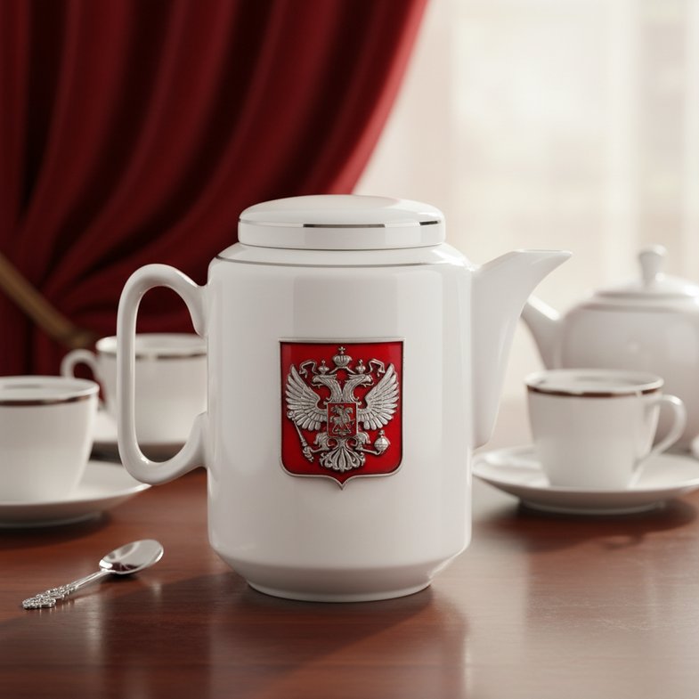 Например, идеальным чайничком для заварки чая считается фарфоровый предмет посуды, так как он имеет свойство идеально прогреваться и сохранять ароматные, а также вкусовые свойства напитка. Само собой, что в его конструкцию должна входить крышечка, не дающая испаряться чайным парам, небольшой носик и удобная ручка, позволяющая разлить напиток по чашкам без риска обжечься. Именно такой чайничек и предлагает в составе комплекта производитель. Помимо правильных материалов и форм, для изделия был предусмотрен уникальный дизайн, предполагающий на поверхности чайника гербовый знак РФ с красным знаменем и золотистым двуглавым орлом на его поверхности.