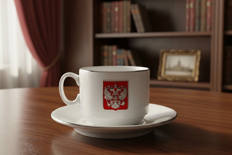 Внешний вид кружки в значительной степени задается и определяется впечатляющим металлическим барельефом, который надежно закреплен на лицевой стороне предмета. Накладка изготовлена из сплава на основе алюминия по технологии точного художественного литья в форме щита и находящегося на его фоне российского двуглавого орла. Полировка, гальваническая отделка и покрытие полупрозрачной цветной эмалью придают барельефу особую колоритность.