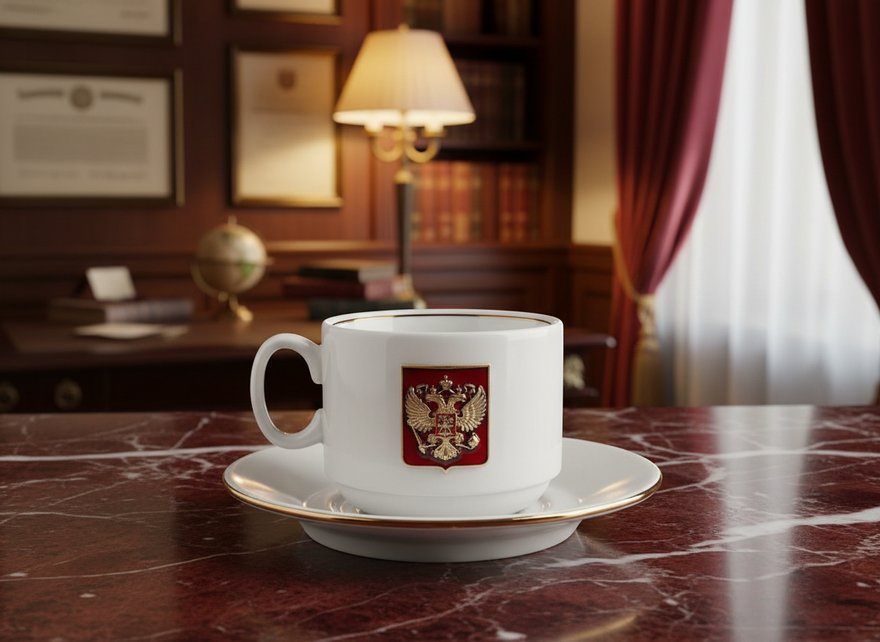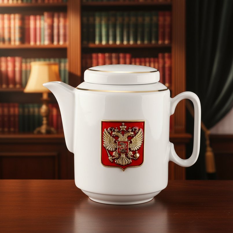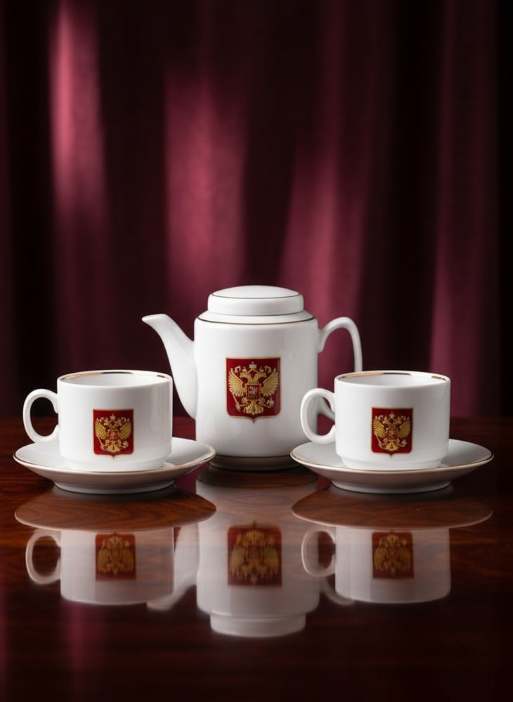 Поверхность предметов покрыта стойкой к температурному и механическому воздействию светлой глазурью. Впечатляющим украшением чайника и чашек стал эффектный барельеф, выполненный по технологии высокоточного художественного литья из алюминиевого сплава. На нем запечатлен сияющий российский герб – коронованный двуглавый орел, облагороженный гальваническим покрытием «под золото». Красное поле геральдического щита под гербом окрашено прочной и термостойкой ювелирной эмалью.