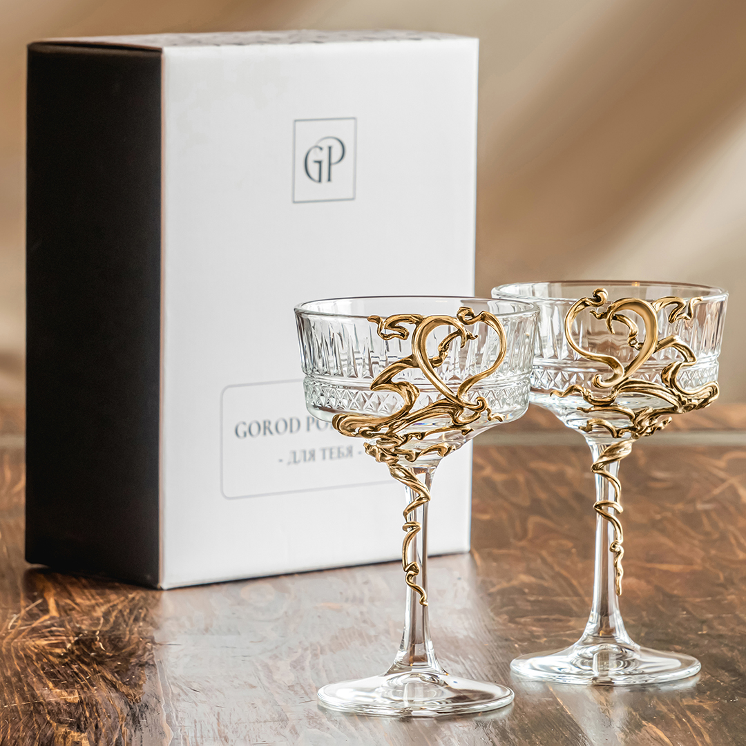 ✓ парные фужеры с местом под бутылку. Посуда шедевральной красоты! Её украшает не только искусный барельеф, но и резная ножка бокала. Товары в данной категории изготовлены из тонкого чешского хрустального стекла Bohemia. Уникальная деталь подобных комплектов – в красивой подарочной коробке предусмотрено место для бутылки шампанского. Кстати, для нее вы также можете заказать металлическую накладку, повторяющую стиль фужеров. За небольшую доплату вы получите поистине царский подарок: великолепное игристое вино с памятным барельефом и не менее великолепная посуда для его подачи.