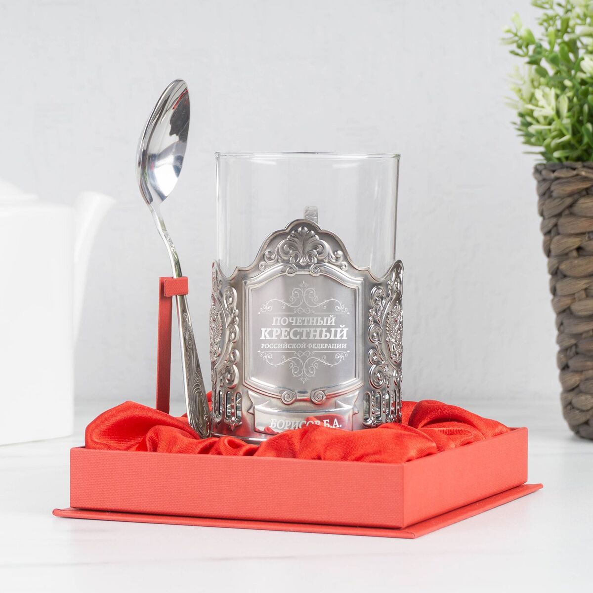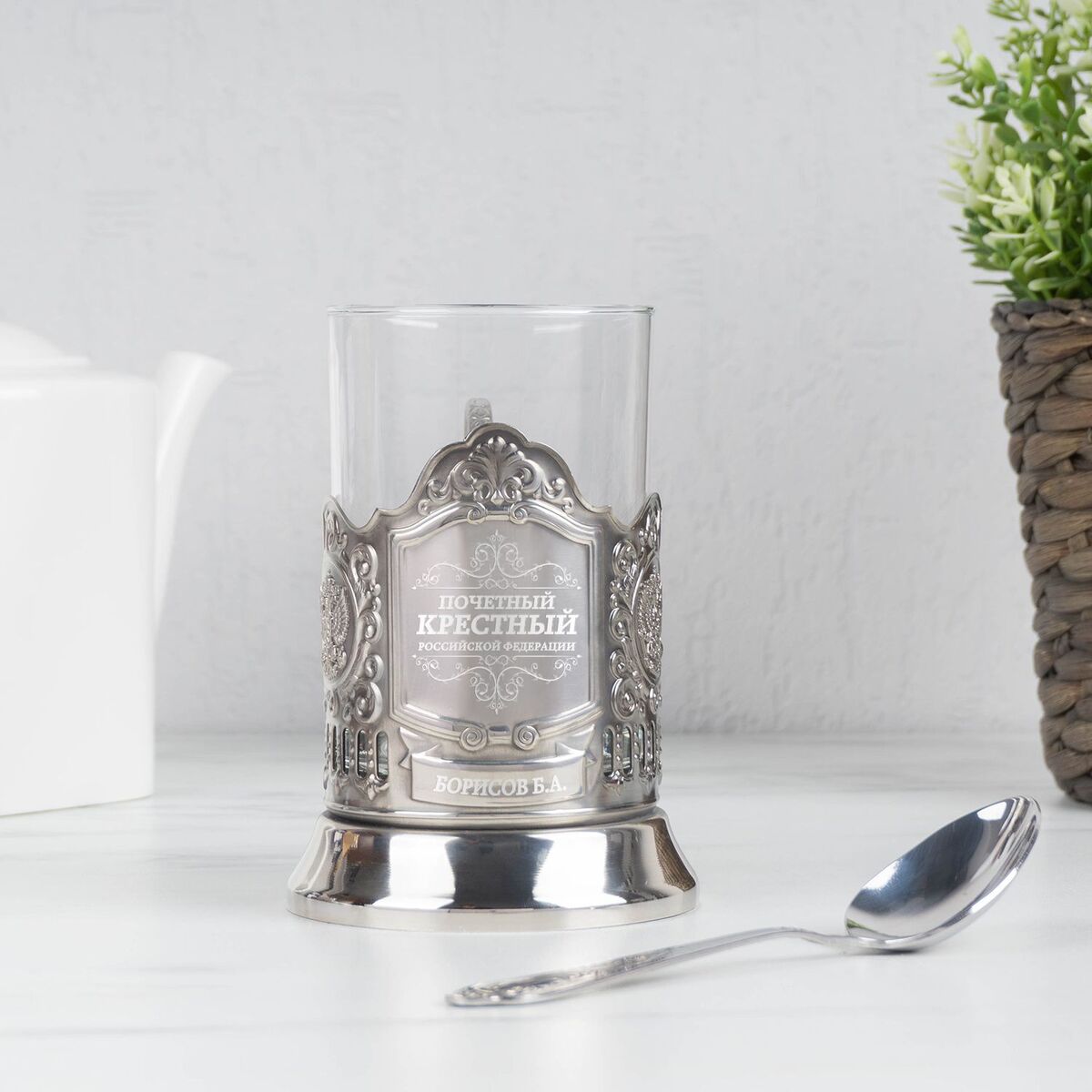 Именной подстаканник «Почетный крёстный» вполне заслуживает самых высоких похвал. Для его изготовления методом точной художественной штамповки был использован специальный латунный сплав, проверенный государственной гигиенической экспертизой. Наружное покрытие предмета выполнено никелевым напылением и серебрением. На боковых сторонах подстаканника оттиснуты российские гербы – двуглавые орлы.