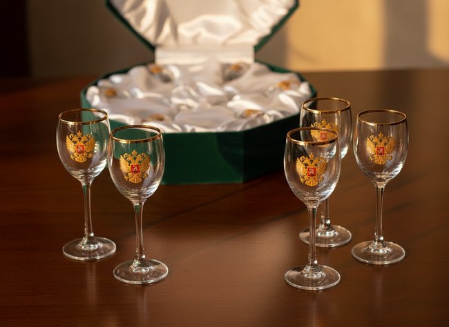 По верхнему краю чаш рюмок сияет эффектный золотой ободок. Их лицевые стороны украшены впечатляющей накладкой барельефом. Она изготовлена из бронзы методом высокоточного художественного литья под давлением. В форме барельефов воплотился российский государственный герб – коронованный двуглавый орел. Поверхность накладок прошла полировку, гальваническую отделку и окраску выемчатой полупрозрачной эмалью.