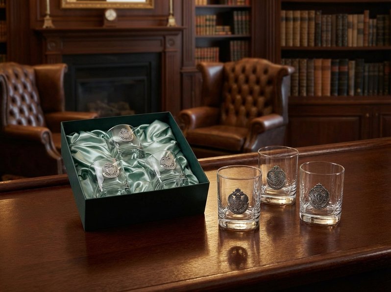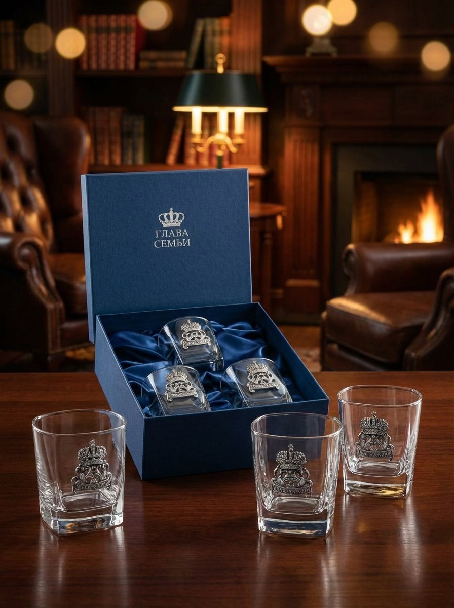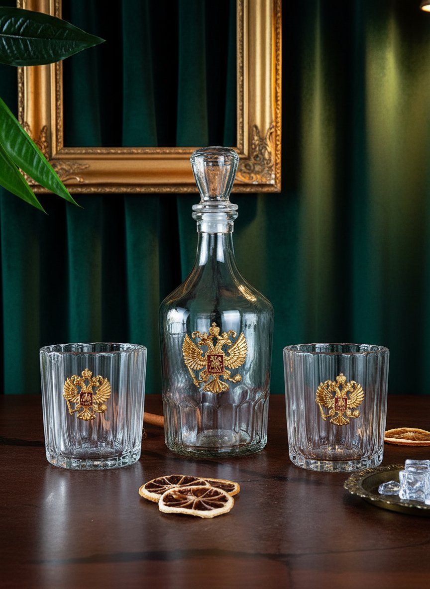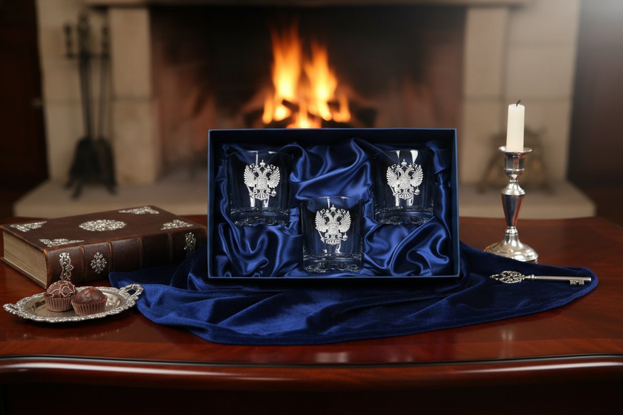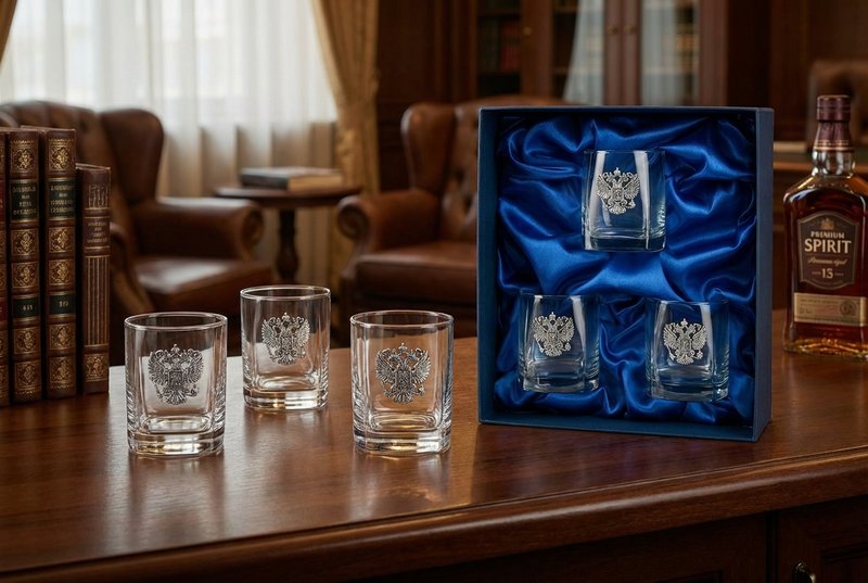 Бюджетные варианты были, оригинальные именные наборы рассмотрели, строгую классику тоже, что дальше, спросите вы? Конечно же, пришло время презентовать вам элитные наборы бокалов для виски, предназначенные для самых успешных и самых влиятельных персон. Статус подарка тут читается в каждой детали. Первое – это материал. Все бокалы изготовлены из редкого чешского хрустального стекла «кристалайт», обладающего идеальной прозрачностью и тонким мелодичным звоном. Второе – форма. Привычные знатокам виски бокалы-тумблеры выглядят словно зафиксированные сосуды в страстном движении танца: настолько эффектно и точно переданы плавные изгибы и линии. Третье – производитель. Известный бренд «CRYSTALITE BOHEMIA» не позволяет усомниться в качестве изделий. Четвёртое – декор. Каждый сосуд украшен барельефом ручной работы – позолоченным или посеребренным двуглавым орлом, символизирующим благородство и власть будущего хозяина. И, наконец, пятое – презентабельная упаковка, обшитая шёлком темно-синего или изумрудного оттенка, с надежной металлической защёлкой, сохраняющая интригу при вручении до самого последнего момента.