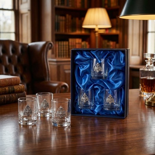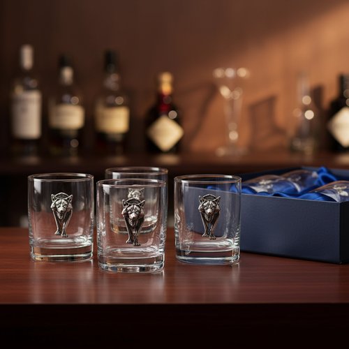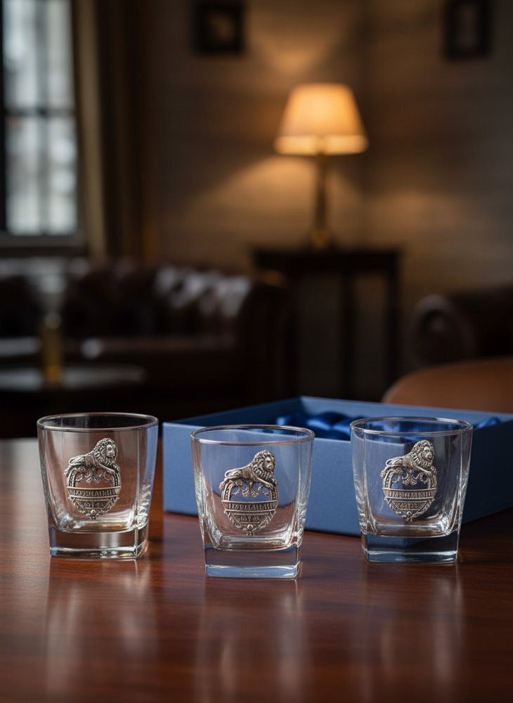 Безусловно, оригинальные подарки – это сейчас модно, а что делать, если нужен строгий деловой презент? Отвечаем – ни в коем случае не закрывать страницу, тем более, что на очереди главные хиты продаж – наборы стаканов для виски с оловянными барельефами в красивой тёмно-синей упаковке. В центре внимания тут всё тот же тумблер но уже объёмом 275 мл, выполненный из упрочнённого чешского стекла с утолщённым дном. На его лицевой стороне красуется тематический барельеф, представленный в зависимости от модели либо двуглавым орлом, либо эмблемой государственного ведомства, либо изображением дикого волка, либо фигурой Фемиды, либо даже бюстом нашего горячо любимого президента… В отличие от своего бюджетного предшественника изготовлена такая накладка не из алюминия, а из пьютера – особого сплава, на 95% состоящего из олова, методом художественного литья. Это позволяет получить уже объёмное изображение с высокой степенью детализации. Чтобы подарок был не просто красивым, но и ценным в глазах одариваемого, каждый барельеф подвергается полировке и чернению, после чего проявляется эффект антикварного серебра. А вот какой пробы – решать только вам в момент презентации своего подарка, если, конечно, получатель не является ювелиром с многолетним стажем…