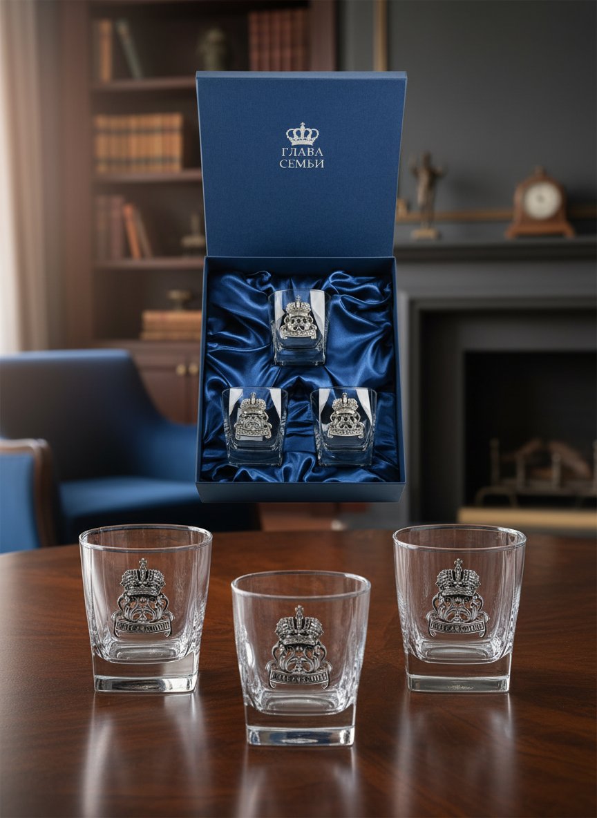 Напоследок мы припасли главное «сокровище» нашей коллекции – наборы бокалов для виски в деревянных ларцах. Этот дорогой подарок с мужским характером впечатлит каждого с первого взгляда. В основе презента находятся бокалы для виски из упрочненного венецианского стекла, украшенные художественным литьём из латуни на патриотическую тематику. Герб Российской Федерации или Герб Советского Союза, изображение Георгия Победоносца или доблестного защитника Отечества – любой авторский дизайн прорисован с детальной скрупулёзностью. Поскольку элитный шотландский напиток принято употреблять в охлажденном состоянии, то каждый набор дополнен мешочком с камнями для виски. Оригинальный завершающий штрих - персональный вкладыш, подтверждающий присвоение будущему владельцу звания «Настоящий мужчина». Конечно, такая красота, требовала особой упаковки. Поэтому было решено поместить набор бокалов для виски в деревянный ларец на золотистых ножках, напоминающий восточный сундучок с драгоценностями, тот самый, что заморские купцы частенько преподносили в дар нашим царям и императорам…