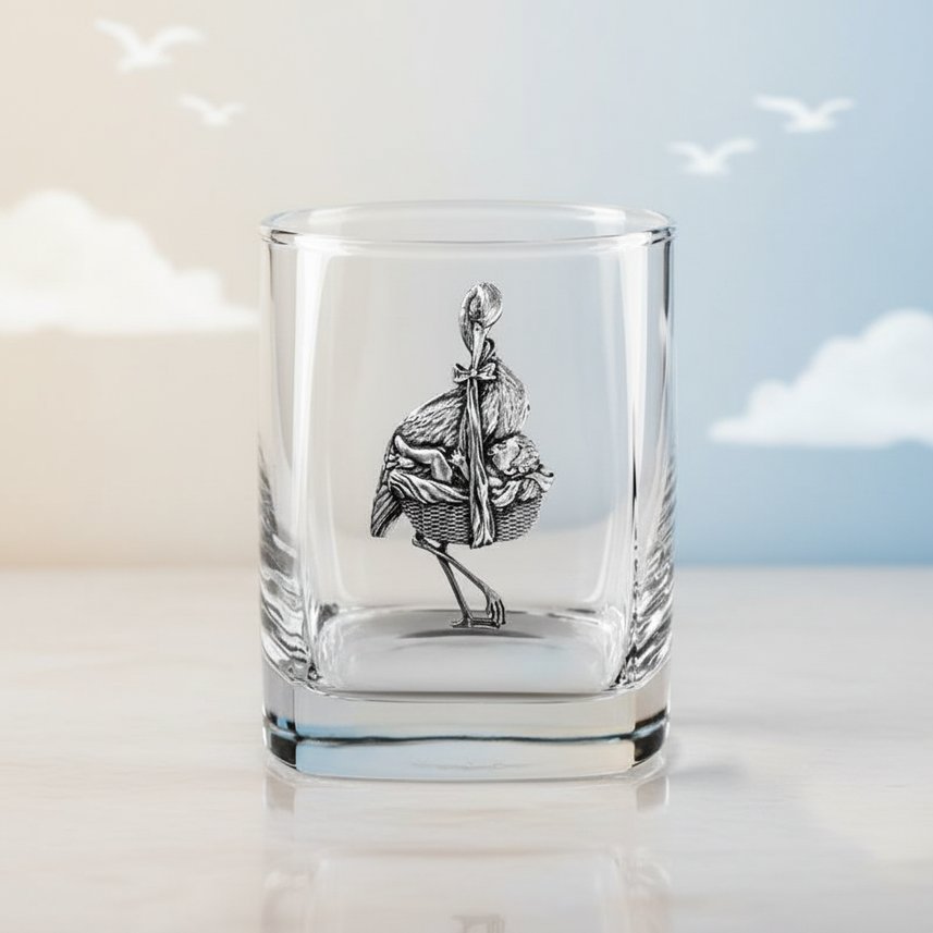Главной и наиболее примечательной деталью бокалов является их металлический декор, выполненный мастерами вручную по способу художественного литья. Накладки изготовлены в виде умиляющей картины, где крохотного младенца, завернутого в пеленку, держит в клюве главный вестник счастливого события – аист. Для барельефов был выбран особый сплав, на 95% состоящий из олова. Но благодаря специальному чернению и полировке накладки стилизованы под антикварное серебро, что делает бокалы весьма представительным и солидным подношением.
