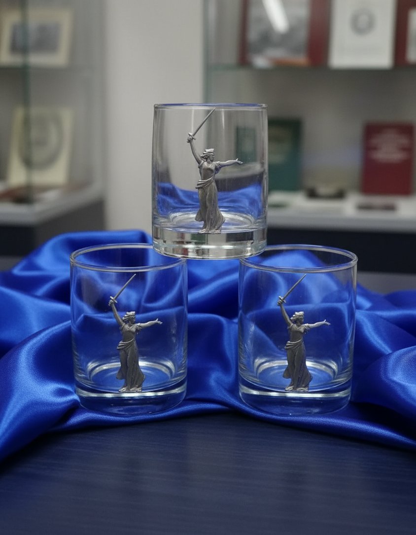 Набор бокалов для виски «Родина-мать» состоит из трех емкостей, каждая из которых с максимальным удобством располагается в ладони. Они отлиты из идеально прозрачного стекла и вмещают по 275 миллилитров «огненной воды». Увеличенная толщина донышек существенно повышает устойчивость питейных аксессуаров на столешнице за счет понижения их центра тяжести.