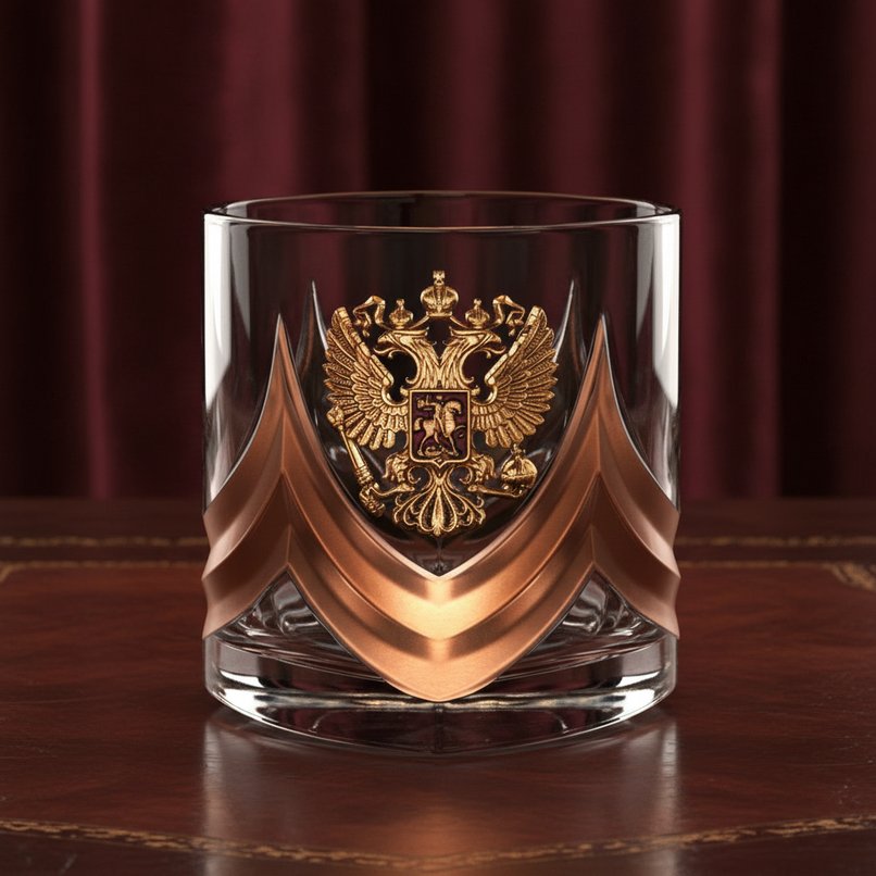 Но просто прозрачный стакан выглядит достаточно бедно в визуальном плане. Такие подают в барах, не боясь, что изрядно выпивший посетитель случайно разобьёт сосуд об пол. Для оригинального подарка и домашнего использования нужно что-то более интересное. Герб с точным изображением двуглавого орла в бронзовом переливе с объёмными деталями – отличное решение для любого патриота своей Родины. В качестве материала для декора используется действительно настоящая бронза – металл, не боящийся окисления, коррозии и прочих негативных изменений в процесс эксплуатации.