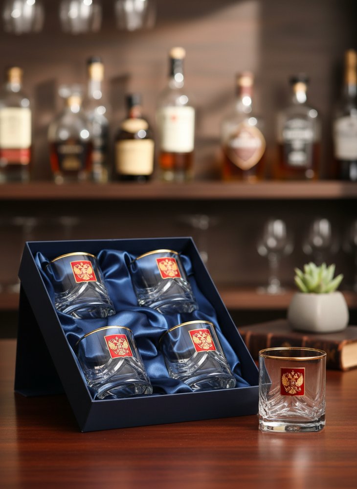 Набор бокалов для виски «За Россию!» изготовлен из отборного стекла повышенной прочности опытными мастерами-стеклодувами. В него вошли четыре емкости для прочувствованной дегустации напитка, востребованного настоящими мужчинами. Каждый из этих сосудов способен вместить по 320 миллилитров высококачественного спиртосодержащего зелья.