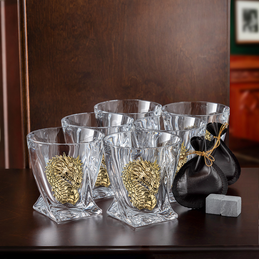 | Детали | В наборе 6 бокалов для виски формы "квадро" с накладками из латуни, стеатитовые камни для охлаждения напитка в кожаном мешочке, деревянная шкатулка |