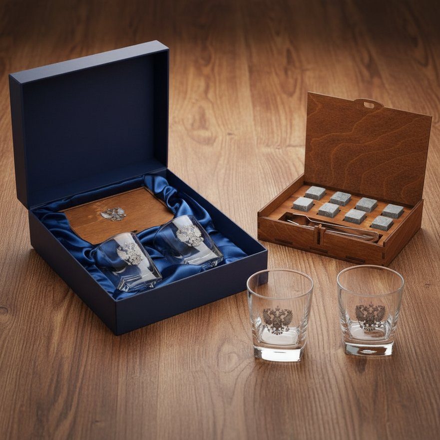 Подарочный виски-сет «Россия» придется по душе даже самому требовательному мастеру дегустации горячительных напитков. В него включены два классических стакана для импортного эликсира, а также деревянный бокс с уложенными в него щипцами и камнями для виски.